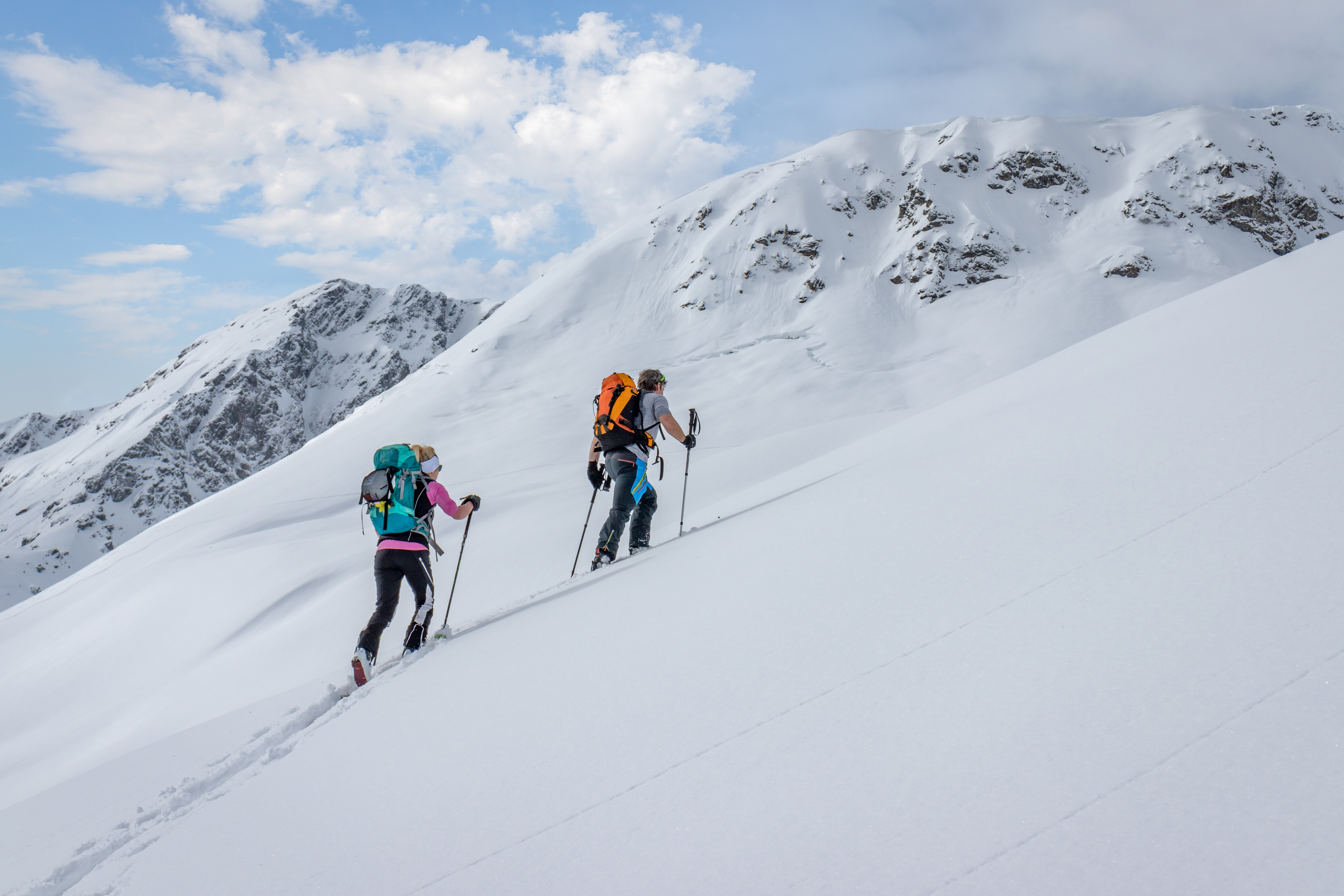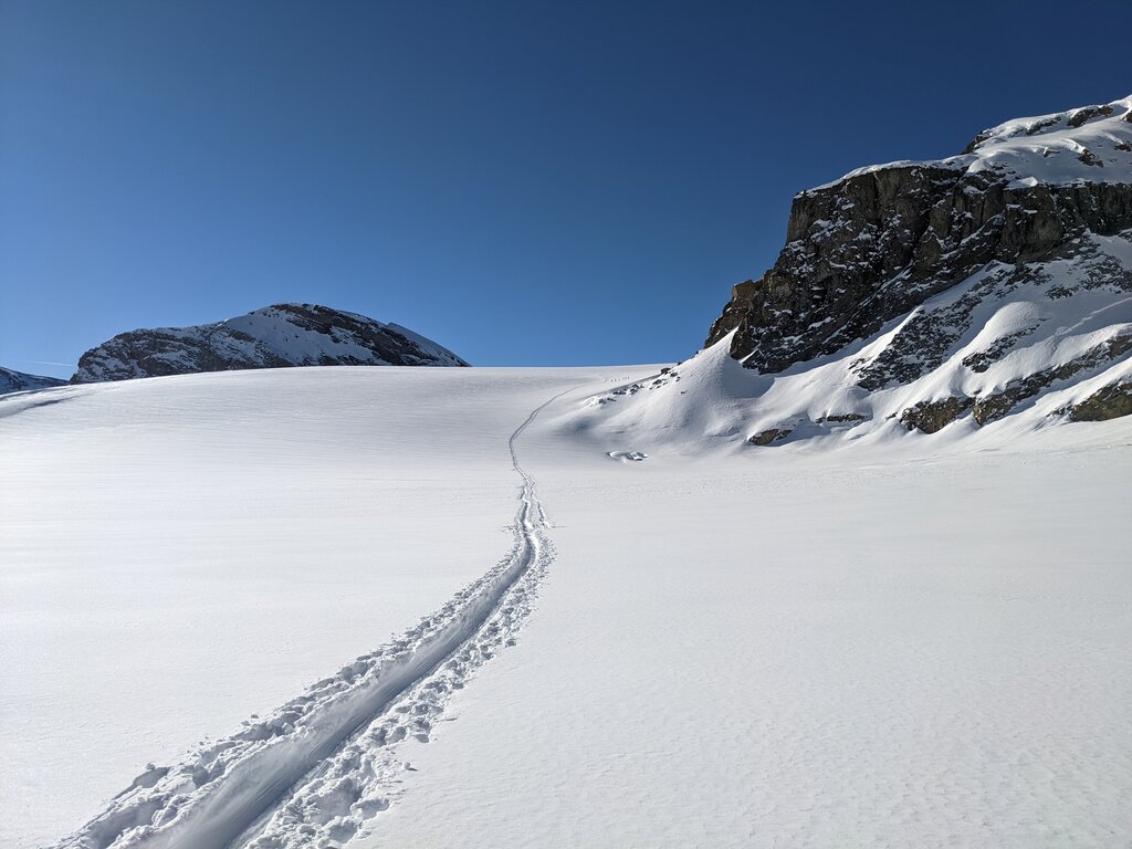 <Auch an unserem letzten Tourentag steht wieder ein Dreitausender auf dem Programm. Anfangs steigen wir auf in Richtung Fuorcla d'Agnel, hier sind wir am ersten Tag beim Hüttenzustieg abgefahren. Noch vor der Scharte zweigen wir ab zum Piz Surgonda. Bei guten Verhältnissen kann die Abfahrt fast direkt am Gipfel gestartet werden, ansonsten geht es ein paar Meter mit Ski am Rucksack den Gratrücken entlang zum Start. Über ideale Hänge rauschen wir nun abwärts bis direkt zum Ausgangspunkt unserer Tourentage an der Julierpass-Straße. Hier verabschieden wir uns gegen 14 Uhr voneinander.