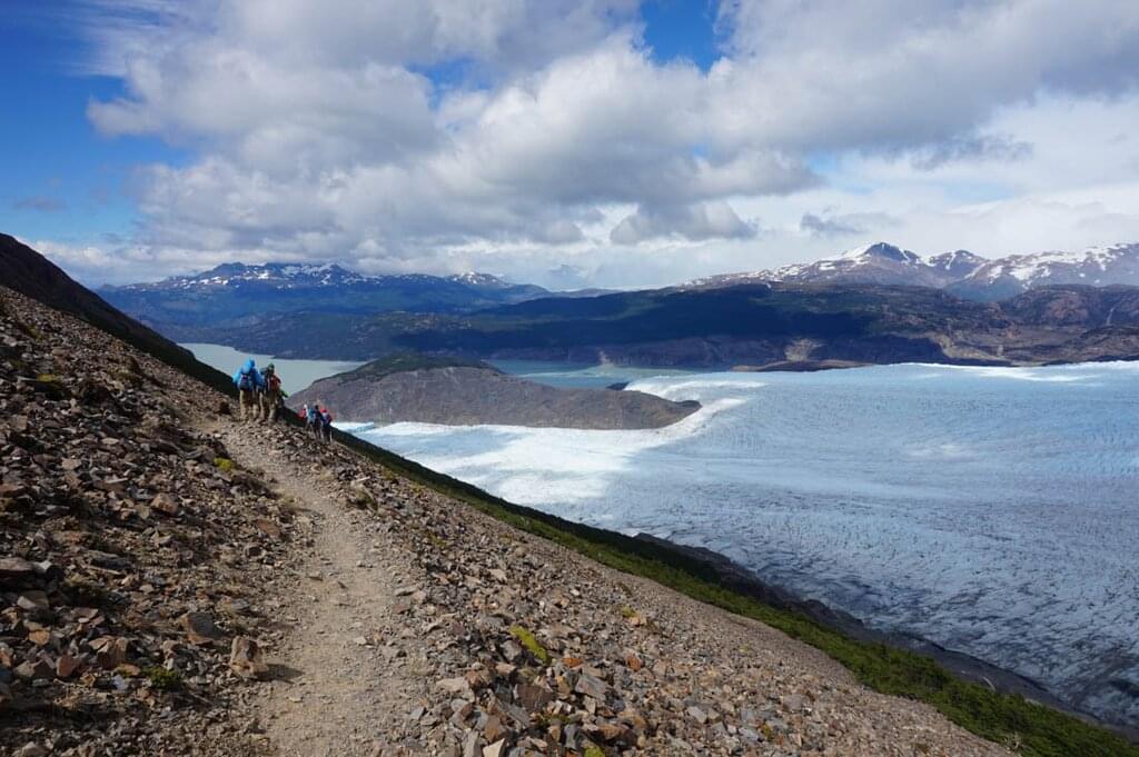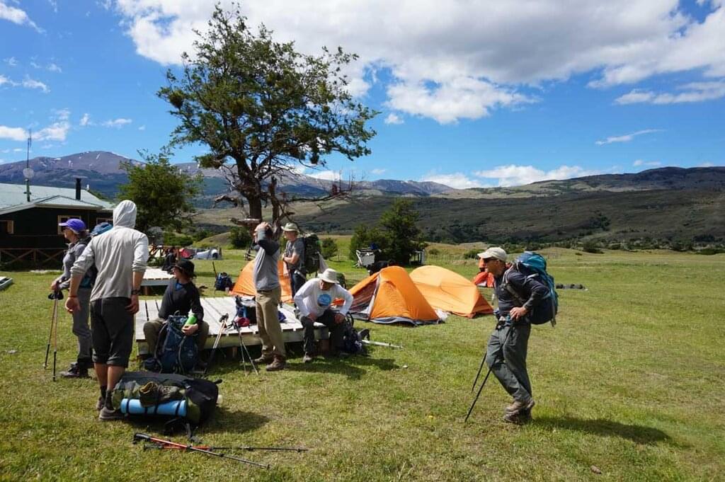 <Nach einem frühen Frühstück auf dem Campingplatz beginnst du deine Wanderung zum Dickson Lake, der am Rande der südlichen patagonischen Eiskappe liegt. Der See wird von dem gleichnamigen Gletscher gespeist und fließt jetzt sowohl nach Chile als auch nach Argentinien. Du wanderst an leuchtenden, blühenden Notro-Sträuchern (nach ihrer leuchtend roten Farbe auch chilenische Feuersträucher genannt) vorbei, die in der patagonischen Region endemisch sind, und überquerst einen kleinen Bach neben dem See. Setze die Wanderung entlang des gewundenen Flusses fort, bis du dein Refugio für die Nacht erreichst. Eingebettet in grasbewachsene Hügel mit einem hohen Horizont aus Gipfeln, wird der Dickson Campingplatz eine willkommene Erholung sein. Hier hast du die Möglichkeit, eine heiße Dusche zu nehmen, bevor ein gemeinsames Abendessen serviert wird. Dickson ist als magischer Ort bekannt, mit einer wirklich einzigartigen Landschaft und einem Gefühl der Unwirklichkeit. Wenn es die Wolken zulassen, solltest du heute Abend unbedingt die Sterne beobachten!