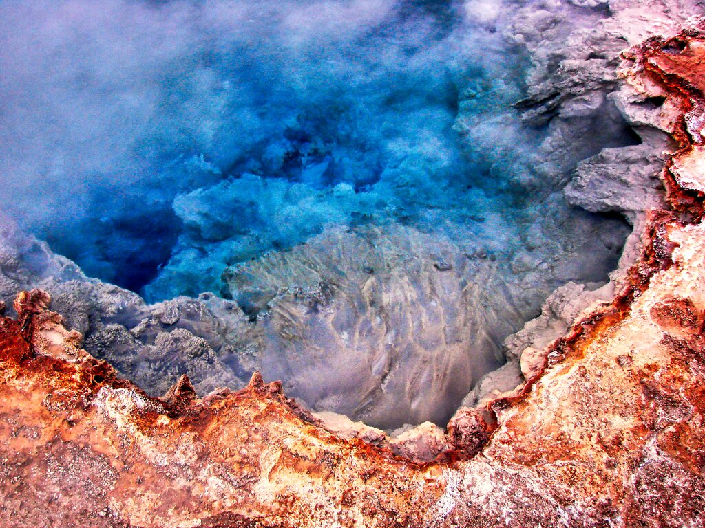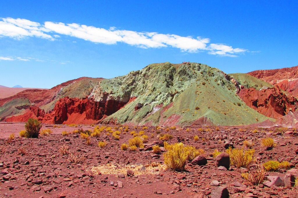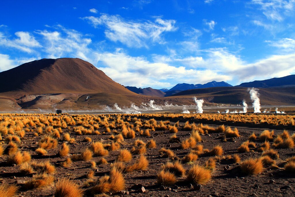 <Bei Sonnenaufgang starten wir unsere Fahrt zum Andenplateau und bestaunen die Feuchtgebiete Machuca und Putana, die für ihre reiche Artenvielfalt bekannt sind. Unser Ziel sind die Tatio-Geysire, wo wir die beeindruckende geothermische Aktivität der Region erleben – mächtige Thermalquellen und Fumarolen, die mehrere Meter in die Luft steigen. Danach besuchen wir das malerische Dorf Machuca und erkunden die kunstvollen Petroglyphen von Yerbas Buenas und das geologische Wunder des Regenbogentals.