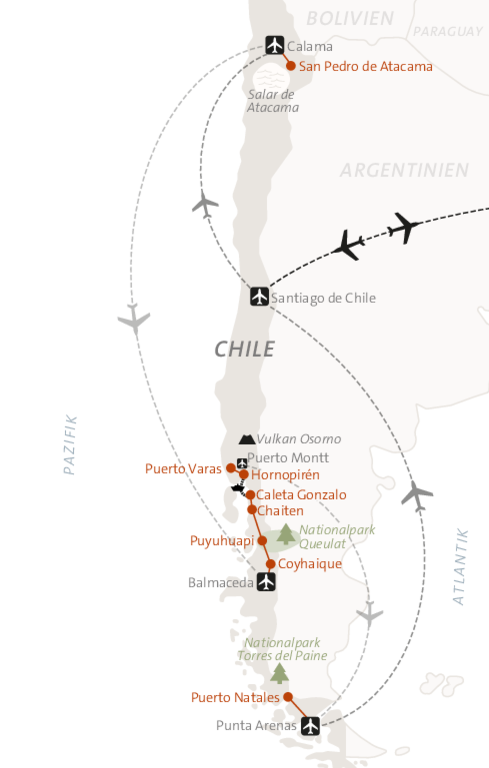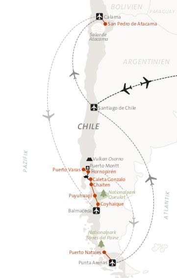 Erlebe die Vielfalt Chiles auf einer einzigartigen Reise. In Santiago tauchen wir in das pulsierende Stadtleben ein und genießen edle Weine. Weiter geht es in die Atacama-Wüste mit ihren bizarren Felsformationen, brodelnden Geysiren und traditionellen Andendörfern. Die Carretera Austral führt uns von der kargen Steppe in üppige Regenwälder und Fjorde. In Patagonien entdecken wir hängende Gletscher und erklimmen Vulkane. Im Alerce Andino Nationalpark erwartet uns unberührte Natur. Im Vicente Pérez Rosales Nationalpark bestaunen wir dichte Urwälder und die grandiosen Panoramen des Vulkans Osorno. Zum krönenden Abschluss erleben wir das Wanderparadies Torres del Paine und lassen uns von der wilden Schönheit Patagoniens verzaubern.