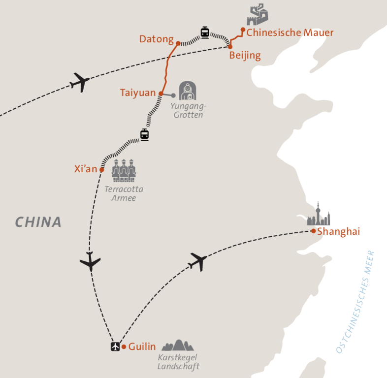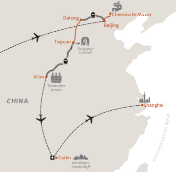 China – ein Land voller Geschichte, Gegensätze und faszinierender Landschaften. Nördlich von Peking schlängelt sich die Chinesische Mauer durch grüne Bergketten, wo wir auf einer leichten Wanderung das monumentale Bauwerk aus nächster Nähe erleben – ein unvergesslicher Moment. In Xi’an begegnen wir dem kaiserlichen Erbe des Landes und bestaunen die weltberühmte Terrakotta-Armee, eines der größten Zeugnisse chinesischer Kultur. Weiter südlich erwarten uns die bizarren Karstberge und mystischen Reisterrassen, die wir zu Fuß und per Fahrrad erkunden. Beim gemeinsamen Kochen mit Einheimischen entdecken wir die Geheimnisse der vielfältigen chinesischen Küche. Den krönenden Abschluss bildet Shanghai – eine schillernde Metropole, in der Tradition und Moderne auf faszinierende Weise verschmelzen.