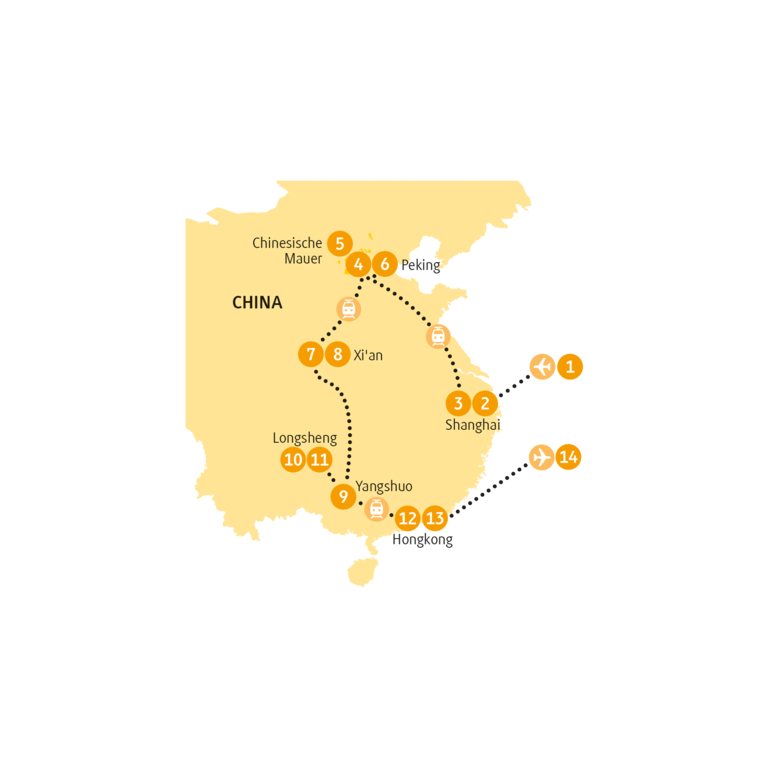 Mit 430 km/h in den Hexenkessel Shanghai. In fünf Bahnstunden 1.300 Kilometer zur Verbotenen Stadt. Garten der Tugend. Die Halle, in der man den Pirolen lauscht. Danach Chinesische Mauer. Xi’an, die alte Kaiserstadt, mit dem Rad auf der alten Stadtmauer entlang. Über 7.000 Soldaten der Terrakotta-Armee. Die sagenhafte Postkarten-Idylle von Yangshuo. Grandioses Finale in Hongkong, mit der Straßenbahn und der längsten Rolltreppe der Welt. Vergisst du nie.