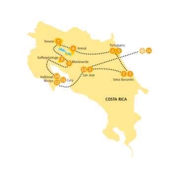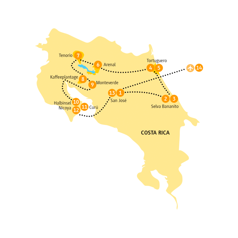 <Grün, grüner, am grünsten – das ist Costa Rica. Los geht´s. Am Flughafen der Hauptstadt San José erwartet dich deine Reiseleitung und bringt dich ins Hotel. Dort kannst du dich nach einer kleinen Stärkung vom langen Flug erholen.
