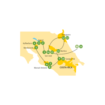 <Nach dem Frühstück folgst du dem Kaffeeduft und erreichst so schon bald die Familie Bello, die eine ökologische Kaffeefarm betreibt. Ein Familienmitglied erzählt dir auf einem Rundgang über die Finca viel Interessantes über Kaffeeanbau und die Geschichte des Kaffees. Nach der Theorie folgt die Praxis. Im vom Urgroßvater erbauten Haupthaus erwartet dich duftender Kaffee, köstlich zubereitet im costaricanischen Chorreador. Und weil es inzwischen Mittagszeit ist, gibt es dazu hausgemachte Spezialitäten zum Probieren. Gestärkt geht es weiter bis zu deinem Tagesziel, dem Nebelwald Monteverde.