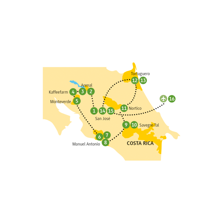 <Bereit für das Abenteuer Costa Rica? Du fliegst nach San José, in die quirlige Hauptstadt Costa Ricas. Nach der Landung erwartet dich deine Reiseleitung voller Vorfreude, um dir die Heimat in den nächsten zwei Wochen näherbringen zu dürfen.
