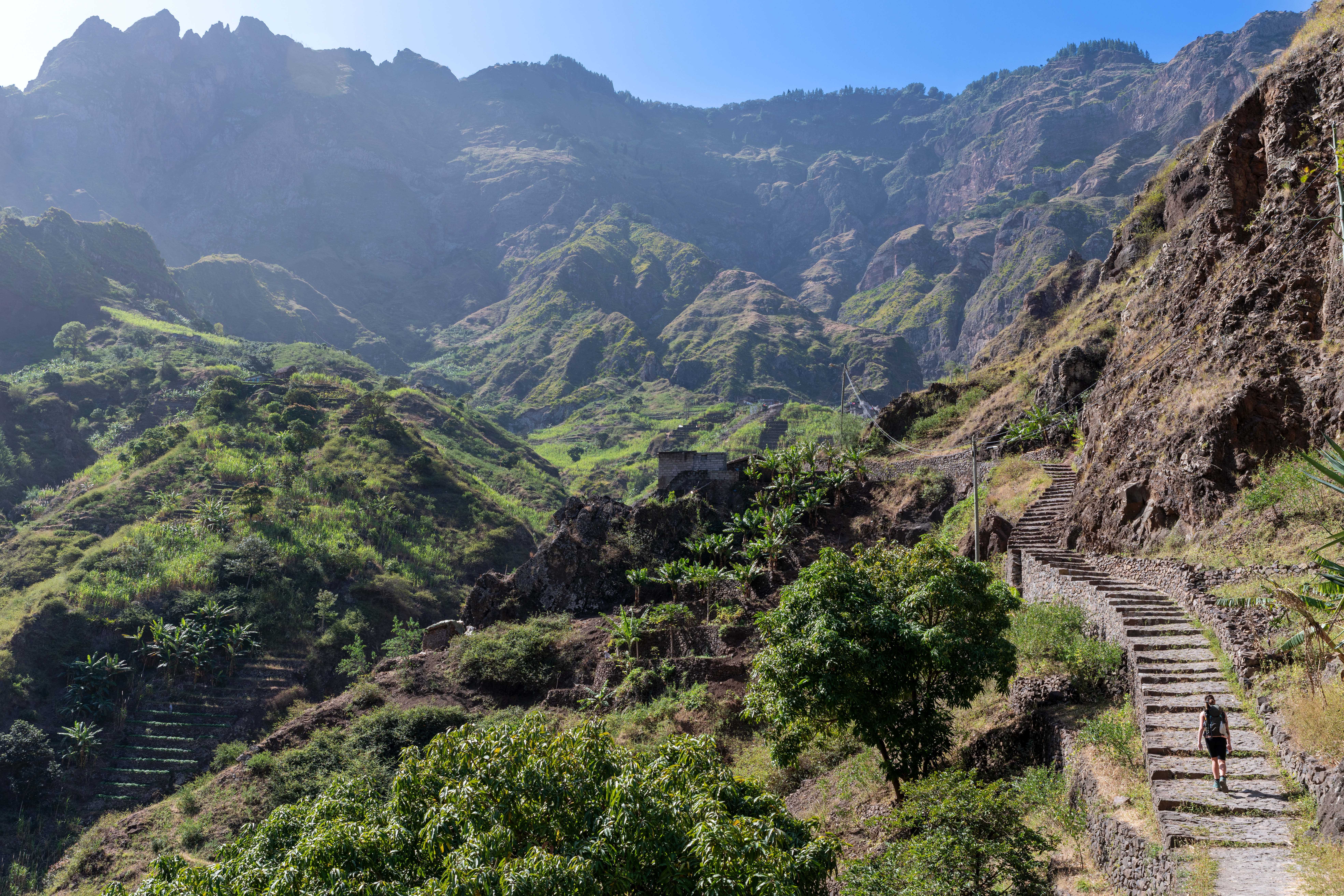 <Auf der Wanderung in einem Nebental des Ribeira Grande geht es vorbei an zahlreichen kleinen Dörfern und landwirtschaftlich genutzten Hängen. In Cha das Pedras, einem typisch kapverdischen Dorf, kehren wir zum Mittagessen ein. Anschließend besuchen wir Ribeira da Torre, bevor wir zurück zu unserem ECO VILLAGE fahren.
