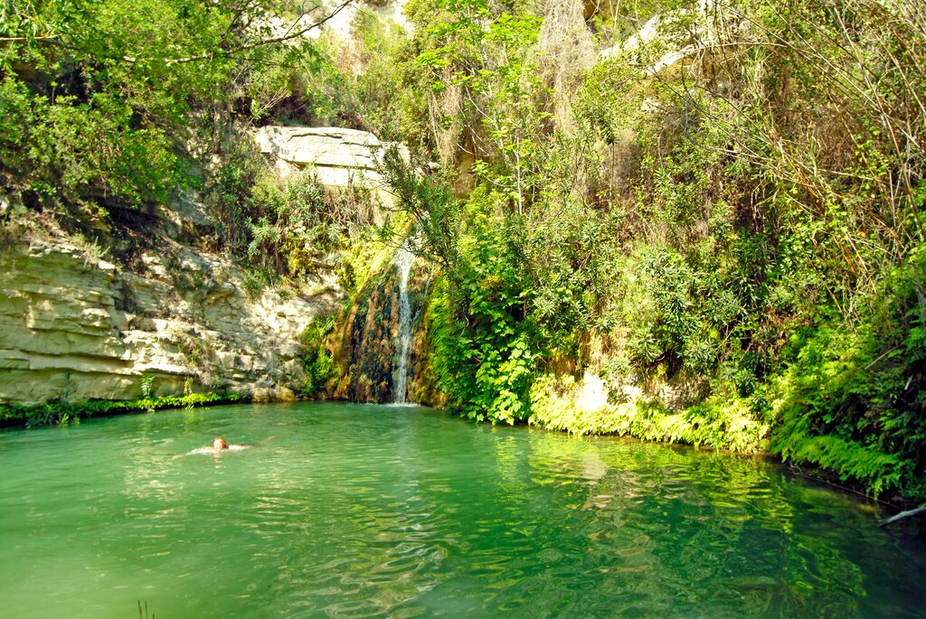 <Ein Transfer bringt uns in die malerischen Höhen des Troodos-Gebirges, wo wir am Fuße des Olympos – dem höchsten Berg Zyperns – unsere Wanderung beginnen. Ein gepflegter Naturpfad führt durch duftende Kiefernwälder und öffnet immer wieder den Blick auf die weiten Berghänge. Schon bald erreichen wir das idyllische Kyos-Bachtal und folgen dem plätschernden Wasserlauf tiefer hinein. Das Tal wird zunehmend schmaler, bis es sich zu einer beeindruckenden Schlucht verengt. Über in den Fels gehauene Stufen gelangen wir schließlich zu den Kaledonischen Wasserfällen, die in mehreren Stufen über moosbewachsene Felsen herabstürzen.