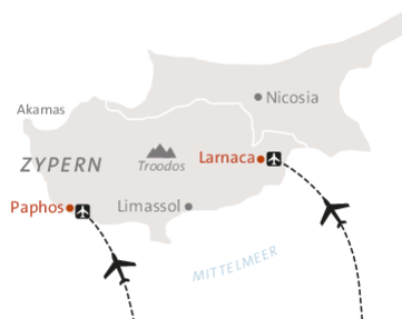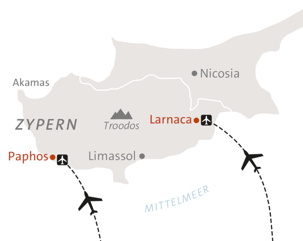 <Deine Reise startet mit dem Flug nach Larnaca oder Paphos. Am Flughafen wirst du von einem ASI-Vertreter empfangen und zu deinem Hotel gebracht. Da die Ankunftszeiten der Flüge variieren, kann es zu etwas Wartezeit kommen. Achte am Flughafen einfach auf das ASI-Willkommensschild mit unserem Logo, damit du dein Transferteam schnell findest.