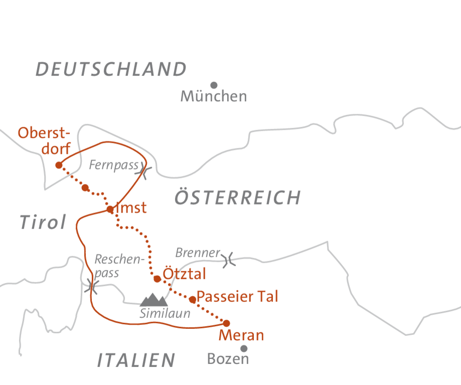 Von Oberstdorf nach Meran - wer denkt da nicht an den viel begangenen Fernwanderweg E5? Unmittelbar neben diesem stark frequentierten Weg bietet unsere Route über die Alpen viel Komfort. Jeden Abend kehren wir wieder ins Tal zurück und genießen die Annehmlichkeiten von ausgesuchten Hotels und Gasthäusern, damit wir am nächsten Tag wieder gut ausgeruht weiter wandern können. Abseits der Hauptroute des E5 erwarten uns herrliche Wanderungen und Passübergänge am Alpenhauptkamm. An der Südseite der Alpen ist unser Ziel Meran mit seinem mediterranen Flair.