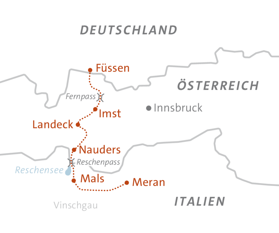 Auf dieser leichten Alpenüberquerung kombinieren wir Natur und Kultur. Wir folgen der antiken Römertrasse Via Claudia Augusta und erwandern auf einfachen Wanderungen, neben der grandiosen Bergwelt, auch kulturelle Highlights. Von den Königschlössern in Bayern führt die Route über die Burg Ehrenberg, den Fernpass und den Tiroler Burgenweg bis ins sonnenverwöhnte Vinschgau. Ein typischer Waalweg bringt uns dann in die Südtiroler Alpenmetropole Meran. Wir tauchen ein in eine geschichtsträchtige Wanderung über die Alpen.