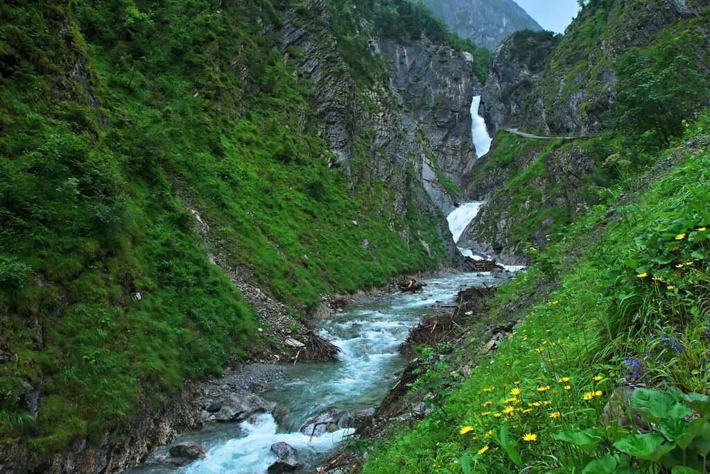 <Wir treffen uns im Zentrum von Oberstdorf. Danach fahren wir mit dem Bus nach Spielmannsau. Von hier steigen wir zu Fuß durch den Sperbachtobel hinauf zum ersten Stützpunkt unserer Alpenüberquerung – der Kemptner Hütte (1.846 m).