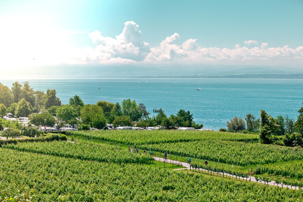Zu Fuß führt unser Reiseleiter Sie am Ende der Stadtführung in ein am Hang gelegenes Villen- und Universitätsviertel. Hier am Stadtrand von St. Gallen warten wieder die Räder auf Sie. Bis wieder hinab ans Seeufer führt nun eine Radstrecke, auf der man häufiger bergab als bergauf fährt. Zwischendrin bieten die Reiseleiter einen Transfer für einen 7,5 km langen, besonders hügeligen Abschnitt an, der von E-Bikes aber - auf Wunsch - durchaus gefahren werden kann. Langsam nähern wir uns auf landwirtschaftlich genutzten Wegen und kleinen Sträßchen dem Seeufer, welches wir am Vortag verlassen haben.