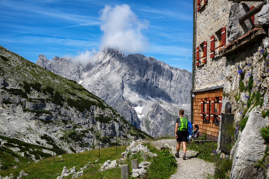 <Über die Einsattelung des Hundstodgatterls verlassen wir heute das Steinerne Meer und setzen unseren Weg durch das fast ebenso imposante und wildromantische Wimbachtal fort. Wir wandern zwischen den beiden Berchtesgadener Gebirgsgiganten, dem Watzmann und dem Hochkalter durch eine aufregende Felskulisse. Angekommen in Ramsau haben wir uns unser Abendessen redlich verdient.