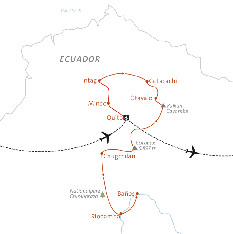 Imposante Vulkanriesen, dichte mystische Nebelwälder, vielfältige Nationalparks und idyllische Bergdörfer erkunden wir per E-Mountainbike überwiegend abseits touristischer Pfade. Wir verlassen die Hauptstadt Quito und dringen in den Süden bis zu den majestätisch empor ragenden Vulkangipfeln des Cotopaxi und Chimborazo vor. Mit dem E-Bike meistern wir ohne Anstrengung jeden Anstieg und nach spannenden Downhillfahrten entspannen wir in heißen Thermalquellen, besuchen bunte Märkte, wandern zu türkis blauen Seen, begegnen den herzlichen Einheimischen und genießen deren kulinarische Köstlichkeiten.