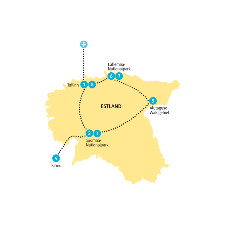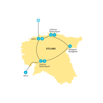 <Zu Fuß entdeckst du vormittags die mittelalterliche Bilderbuch-Stadt Tallinn. Mit ihrer eindrucksvollen Stadtmauer samt den hohen Wehrtürmen, den behelmten Kirchen und bunten Häusern, die so dicht stehen, als stützten sie sich gegenseitig, hat die einstige Hansestadt ihren Charme bewahrt. Über der Altstadt, die zum UNESCO-Weltkulturerbe zählt, thronen die Domkirche und der Burgturm Langer Hermann, zwei Wahrzeichen von Tallinn. Auf deiner Citytour bewunderst du genauso prächtige Bauten wie den Pulverturm »Kiek in de Kök«, das Toompea-Schloss und die Alexander-Newski-Kathedrale sowie den Domberg, von dem man bei gutem Wetter fast schon Finnland sehen kann. Am Nachmittag fahren wir in den Soomaa-Nationalpark, Europas größtem Regenmoor-Nationalpark. Auf deiner ersten Wanderung läufst du über Holzbohlen durch den feuchten Urwald und lernst die einheimischen Pflanzen und Tiere kennen. Von Sumpfporst über Sonnentau, Moosbeeren und Rosmarinheide bis hin zu riesigen Espen, die in der feuchten West-Taiga ganz typisch sind, findet sich hier alles. Mit etwas Glück zeigen sich dir auch Raubwürger, Goldregenpfeifer, Eidechsen oder die scheuen Birkhühner.