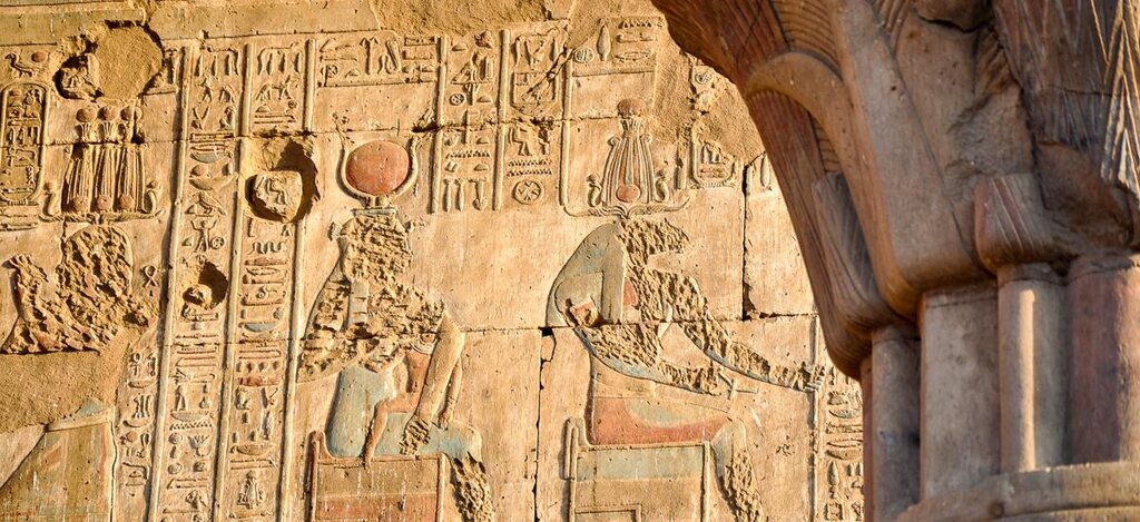 <Genieße einen entspannten Vormittag an Deck und beobachte das Leben entlang des Nilufers. Lies ein Buch oder genieße einfach nur den Moment. Früher oder später – je nachdem, wie gnädig der Wind uns heute gesonnen ist – kommst du nach el-Kab und legst hier für einen kleinen Zwischenstopp an. Die antike Stadt el-Kab – oder auch Necheb – zählte einst zu den größten Städten des Alten Ägyptens und war der Schutzgöttin Nechbet gewidmet. Noch heute sind einige Abschnitte der bis zu elf Meter dicken Lehmziegelmauer, die die Stadt umrundete, sichtbar. Etwas außerhalb der Mauer liegt eine Nekropole mit 31 Felsengräbern, die teilweise mit gut erhaltenen farbigen Reliefs dekoriert sind. Ein Stückchen weiter flussaufwärts kommst du zum Horus-Tempel in Edfu, der dem gleichnamigen Himmelsgott gewidmet ist. Dieser gehört zu den besterhaltenen Tempeln im ganzen Land, und das, obwohl er schon rund 2.000 Jahre alt ist. Horus wird in der ägyptischen Mythologie unter anderem als Falke dargestellt. Es ist also nicht überraschend, dass dich der mächtige Eingangspylon, der in der Breite fast 70 Meter misst, mit zwei überlebensgroßen Falkenstatuen begrüßt. Der Legende nach kämpfte Horus gegen seinen Onkel Seth, mit dem er um die rechtmäßige Thronfolge stritt. Wie der Kampf ausging, verraten dir die Hieroglyphen im Inneren des Tempels, die bis zu ihrer Freilegung im Jahre 1860 zur Hälfte im Wüstensand verborgen lagen.