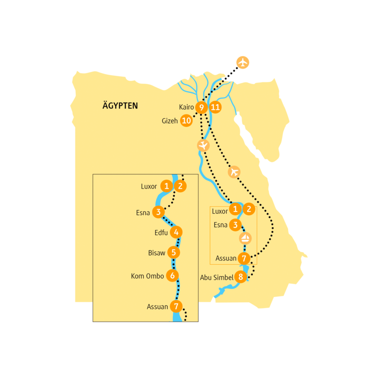 - Inlandsflüge mit Egypt Air von Kairo nach Luxor und von Assuan nach Kairo