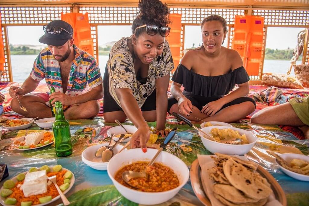 <Der Vormittag steht dir zum Entspannen und Auftanken zur Verfügung. Dann gehst du über Nacht an Bord einer Feluke - dieses traditionelle ägyptische Schiff, das ein bisschen wie ein schwimmendes Zelt aussieht, ist die perfekte Art, den Nil zu erkunden. Den späten Nachmittag verbringst du in einer ruhigen Umgebung und vertiefst dich in ein gutes Buch oder spielst mit deiner Gruppe Karten. Je nachdem, wie deine Gruppe heute Abend gestimmt ist, könntest du eine kleine Strandparty unter dem Sternenhimmel feiern. Heute Nacht schläfst du mit dem sanften Schaukeln des Bootes, der warmen Brise auf deinen Wangen und dem Sternenhimmel über dir ein (auf einer Feluke gibt es keine Wände, du hast also einen völlig ungestörten Blick!)