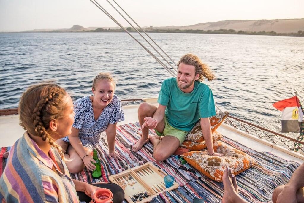 <Der Vormittag steht dir zum Entspannen und Auftanken zur Verfügung. Dann gehst du über Nacht an Bord einer Feluke - dieses traditionelle ägyptische Schiff, das ein bisschen wie ein schwimmendes Zelt aussieht, ist die perfekte Art, den Nil zu erkunden. Den späten Nachmittag verbringst du in einer ruhigen Umgebung und vertiefst dich in ein gutes Buch oder spielst Karten mit deiner Gruppe. Je nachdem, wie deine Gruppe heute Abend gestimmt ist, könntest du eine kleine Strandparty unter dem Sternenhimmel feiern. Heute Nacht schläfst du mit dem sanften Schaukeln des Bootes, der warmen Brise auf deinen Wangen und dem Sternenhimmel über dir ein (auf einer Feluke gibt es keine Wände, du hast also einen völlig ungestörten Blick!)