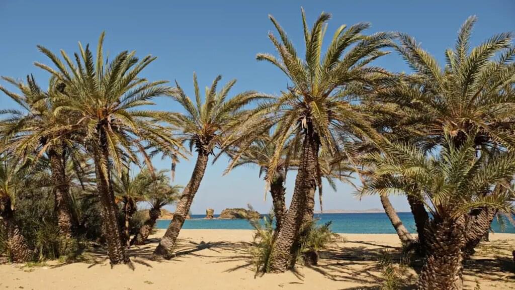 <Wir starten unsere Entdeckung der Insel mit einer aussichtsreichen Küstenwanderung am Lybischen Meer. Direkt von unserer Unterkunft aus wandern wir durch eine von Igelpolsterheide geprägte Landschaft und werfen unterwegs einen kurzen Blick in die Pelekita-Höhle – eine der größten auf Kreta. Weiter geht es entlang der felsigen Küste zum Karoumes-Strand, wo man im kristallklaren Wasser sehr schön und einsam baden kann. Durch einen eindrucksvollen Canyon gelangen wir schließlich zum ruhigen Dorf Chochlakies. Anschließend fahren wir zum berühmten Palmenstrand von Vai, der heute unter Naturschutz steht. Einer Legende zufolge geht die Entstehung auf die arabischen Sarazenen zurück, die dort mit ihren Schiffen lagerten und nach dem Essen Dattelkerne am Strand liegen ließen. -