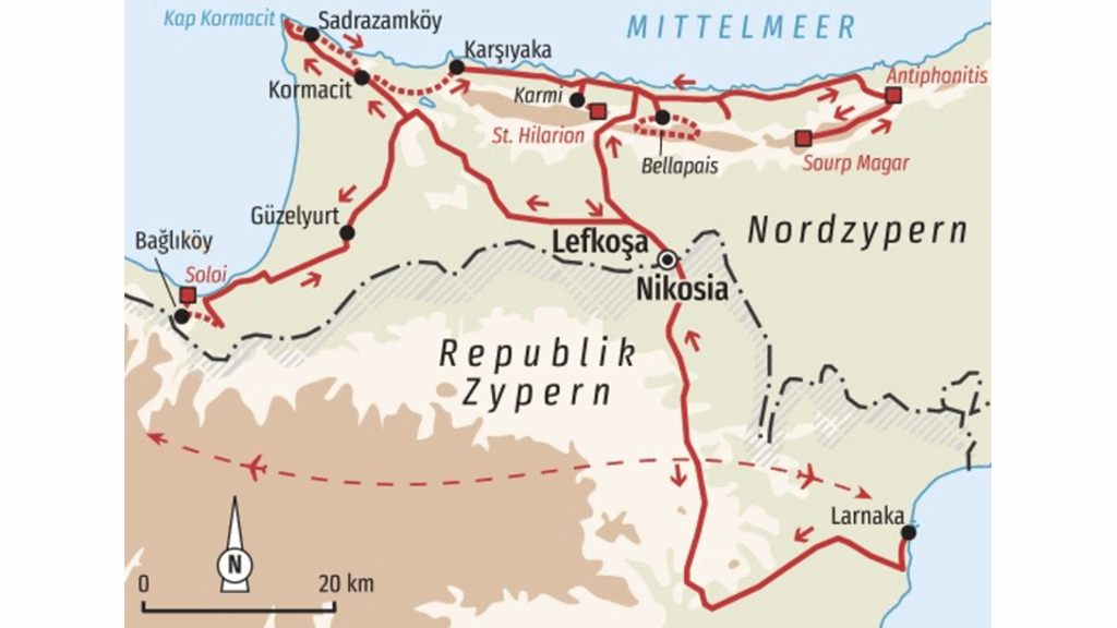 <Der Küstenort Girne erwartet uns am Morgen. Dort besuchen wir die Hafenburg und schlendern durch die Altstadt. Anschließend fahren wir nach Nikosia, wo die Unterschiede zwischen Nord und Süd besonders sichtbar werden. Bei einem Rundgang lernen wir beide Stadtteile der geteilten Hauptstadt kennen. Wir besuchen verschiedene Moscheen und Kirchen, schlendern im Norden durch die Markthalle Bandabuiya und die Karawanserei Büyük Han und im Süden durch das Faneromeni-Viertel bis zum Erzbischofspalast. Weiert geht es nach Bellepais, um dort das gotische Bellepais-Kloster zu besuchen. Im Anschluss brechen wir zu einer Rundwanderung in den Bergen um das Dorf auf. Von dort genießen wir, bei gutem Wetter, die herrliche Aussicht auf das Mittelmeer und die Stadt Kyrenia. Wer möchte, kann die Wanderung auslassen und in Bellepais bleiben. Am Abend kehren wir gemeinsam in ein authentisches, lokales Restaurant ein und lassen uns die köstliche zypriotische Küche schmecken. -