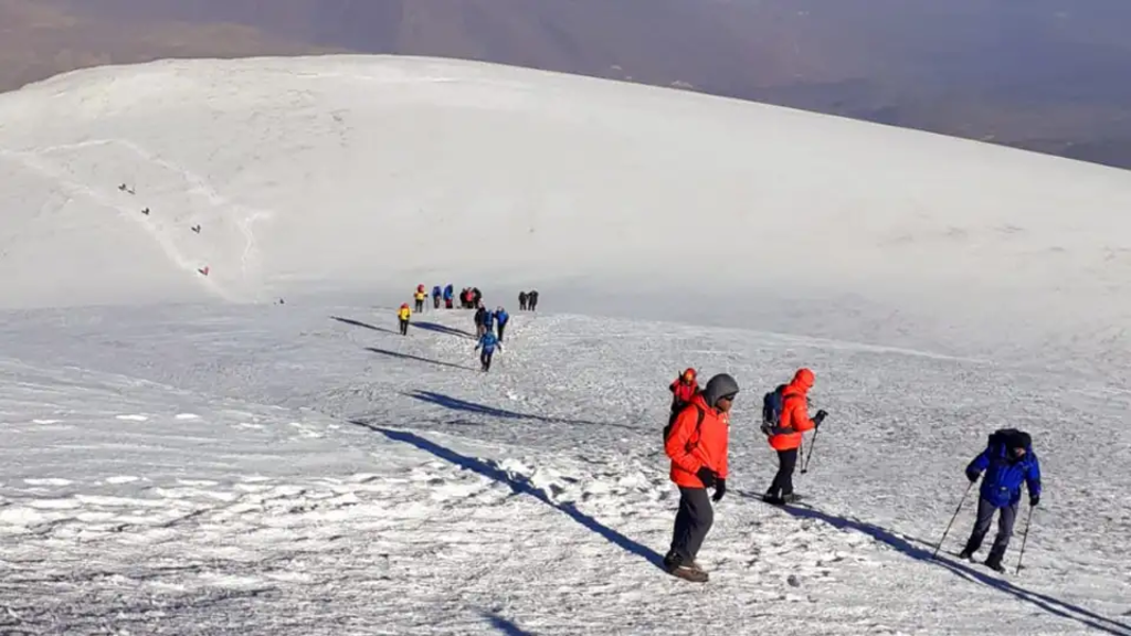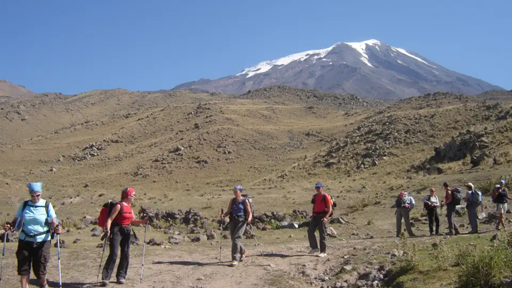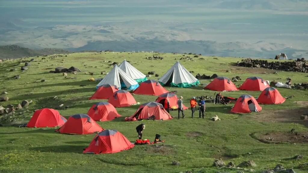 <Heute startet unser Trekking auf den Ararat. Auf dem Weg zum Ausgangspunkt der Besteigung, auf ca. 2.200 m, halten wir an der Militärstation kurz hinter Dogubeyazit. Hier wird unser Besteigungsvisum überprüft und die Besteigung offiziell registriert. Nach insgesamt etwa 1 Stunde Fahrt erreichen wir das Ende der Fahrstraße, hier wartet die kurdische Begleitmannschaft mit Pferden und/oder Mulis auf uns. Sobald das Gepäck auf die Tiere gebunden ist, steigen wir über Wiesenpfade hinauf zum Basislager, das landschaftlich sehr schön an den Hängen des Ararat liegt. Dort essen wir auch zu Abend. -