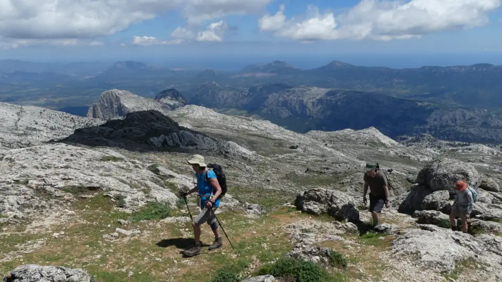<Mit unserem Bus fahren wir zum Berghotel Monte Maccione. Von hier wandern wir auf die Hochebene Pradu und besteigen den höchsten Gipfel des Supramonte, den 1.463 m hohen Monte Corrasi. Oben eröffnet sich uns ein prachtvoller Fernblick über die felsige Wildnis des Supramonte. Je nach Jahreszeit erwartet uns eine Blumenvielfalt, die von Orchideen über Narzissen und Pfingstrosen bis hin zu Lilien reicht – ein herrlicher Kontrast zu den kargen Felslandschaften. Auf der gegenüberliegenden Seite kehren wir über die Sacla é Marras wieder zurück zum Ausgangspunkt und fahren zurück in unser Hotel. -