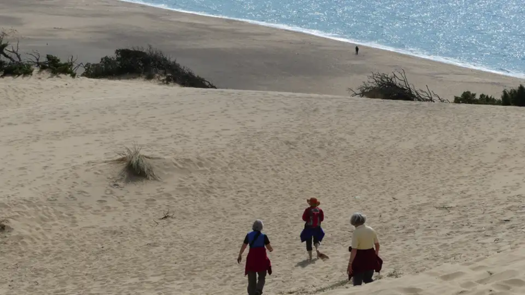<Heute wandern wir hinauf auf den Monte Arcuentu und einen Teil des sich anschließenden Höhenzuges. Diese bizarre Felslandschaft ist vulkanischen Ursprungs, faszinierend sind die Kontraste: felsige Landschaft, grüne Hügel, gigantische Dünen, im Hintergrund das Meer. Schließlich fahren wir zu den Dünen der Costa Verde, auch kleine Sahara genannt. -