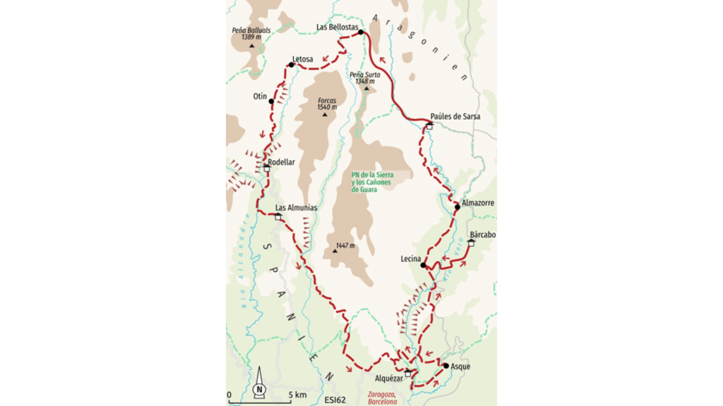Wanderreise durch die Canyons der Sierra de Guara in Aragonien zu Füßen der PyrenäenSteile Felswände, smaragdgrüne Flussläufe und das leise Rauschen des Río Verde – entdecken Sie die faszinierende Canyonlandschaft der Sierra de Guara in Aragonien, eines noch wenig bekannten Naturparadieses zu Füßen der Pyrenäen.Ihr Weg führt Sie durch einsame Schluchten, wilde Bergpässe, über alte Maultierpfade und vorbei an spektakulären Aussichtspunkten. Mit dem persönlichen Roadbook in der Hand wandern Sie von Ort zu Ort: Von der mittelalterlichen Stadt Alquézar geht es über Lecina und Paules bis nach Rodellar, einem charmanten Bergdorf inmitten wilder Natur. Immer wieder eröffnen sich weite Blicke über die zerklüftete Karstlandschaft, wo sich Adler kreisend in den Himmel schrauben. Ein besonderes Highlight: die Wanderung durch die imposante Schlucht des Río Verde – glasklares Wasser, schattige Uferwege und das Gefühl, ganz tief in die Natur einzutauchen.