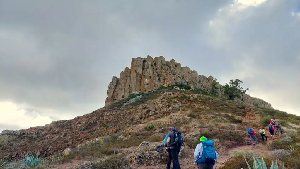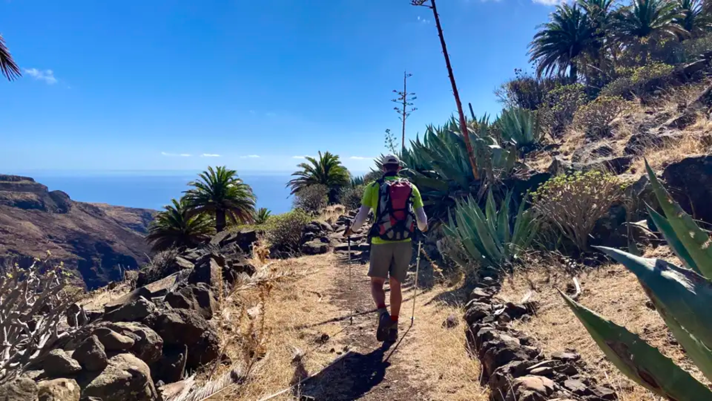 <Wir werden zum Roque de Agando gebracht, von wo aus wir zu unserer heutigen Wanderung aufbrechen. Ein kunstvoll angelegter Felsenweg führt hinab ins Tal und weiter gemütlich zum kleinen Weiler Benchijigua. In der Schlucht wachsen Palmen, an den trockenen Hängen gedeihen Wolfsmilchgewächse, Kakteen und Agaven. Nach einer kleinen Pause wandern wir erst leicht, dann ein Stück steil bergauf, bevor wir über natürliche Felsbänder, vorbei an erstarrtem Vulkangestein und an überhängenden Felswänden entlang an den Pass zum Barranco von Guarimiar kommen. Schon von weitem erkennen wir die weißen Häuschen von Imada. In einer kleinen Bar können wir uns bei einem Imbiss stärken oder mit frisch gepresstem Orangensaft erfrischen. Dann wandern wir weiter nach Agalán, zum einzigen natürlich wachsenden Drachenbaum der Insel. Wie alt der Baum wohl ist und welche Geschichten sich um ihn ranken? Nach unserer Wanderung werden wir vom Bus wieder abgeholt. -