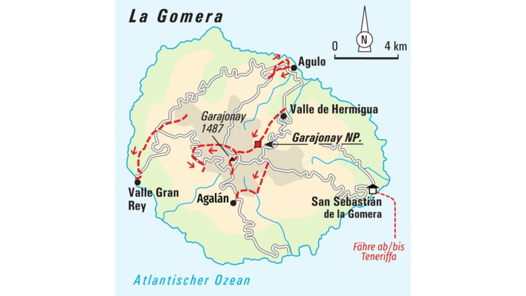 <Der Bus bringt uns zur Kreuzung Las Paredes . Von dort steigen wir auf zum höchsten Gipfel der Insel. Anfangs durch lichten Kiefernwald, später mit guter Sicht auf den Lorbeerwald und bis ins Valle Gran Rey, führt der Weg auf den von Legenden umrankten Garajonay (1.487 m). Wer entdeckt die Nachbarinseln El Hierro, La Palma und Teneriffa? Durch Baumheide und dichten Lorbeerwald wandern wir nun bergab bis zum Töpferdorf El Cercado - hier wird noch nach alter Tradition gearbeitet. Kurz darauf erreichen wir die ehemalige Inselhauptstadt Chipude und können uns hier mit der für die Berge typischen, deftigen Hausmannskost stärken, bevor wir uns auf den Weg zum Tafelberg Fortaleza machen. Wer möchte, kann die knapp 100 Höhenmeter über Steinstufen auf den alten Kultberg der Guanchen hinaufsteigen. Der Aufstieg erfordert Trittsicherheit und Schwindelfreiheit. Nachdem wir die Aussicht auf die umliegenden Schluchten und Täler genossen haben, steigen wir auf dem gleichen Weg wieder ab. Wir werden abgeholt und zurück zu unserer Unterkunft gebracht. -