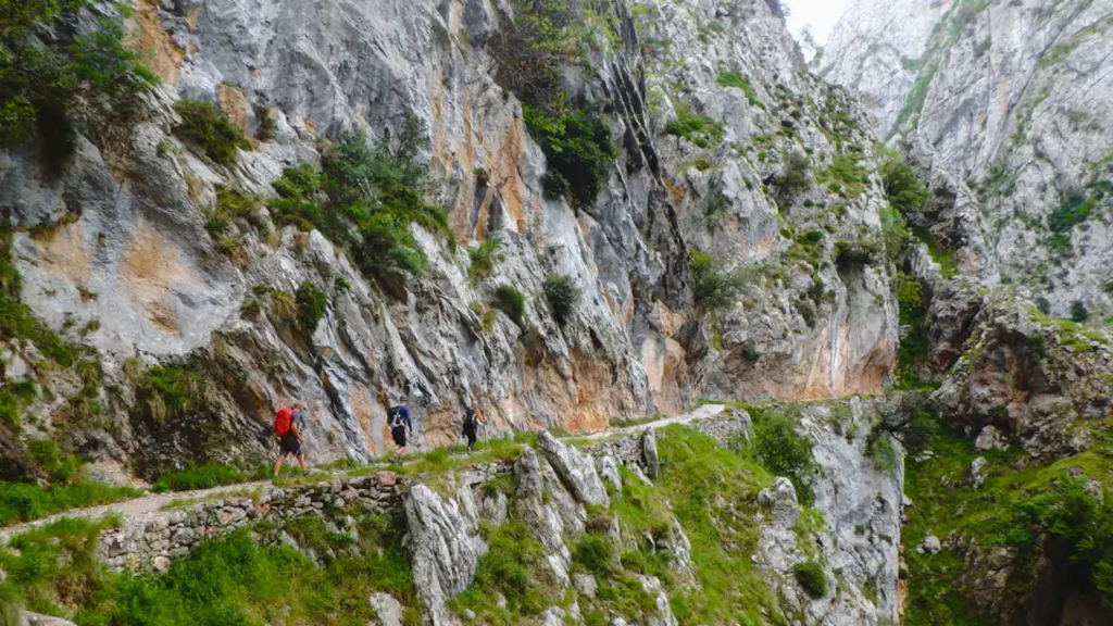 <Am nächsten Morgen schultern wir wieder unsere Rucksäcke und nehmen erneut die Seilbahn. Dieses Mal geht es bergauf und wir starten unsere heutige Trekkingetappe. Wir tauchen tiefer in das imposante Kalkstein-Massiv ein und folgen dem schmalen Pfad, welcher uns auf gerölligem Untergrund in Serpentinen hinauf zum Pass Collada de la Canalona führt. Hier haben wir die Möglichkeit eine Rast einzulegen und die beeindruckende Aussicht auf das Zentral- und Ostgebirge der Picos zu genießen. Wer möchte, kann noch bis zum nahegelegenen Gipfel des Peña Vieja (2.613 m) aufsteigen. Anschließend wandern wir an einem Geröllhang am Rande einer großen Doline, einer trichterförmigen Senke im Karstgestein, allmählich abwärts in Richtung des Naranjo de Bulnes. Am Fuße des markanten Felsenturms kehren wir in der Vega de Uriellu-Hütte ein und freuen uns auf den Sonnenuntergang - hoffentlich über den Wolken. -