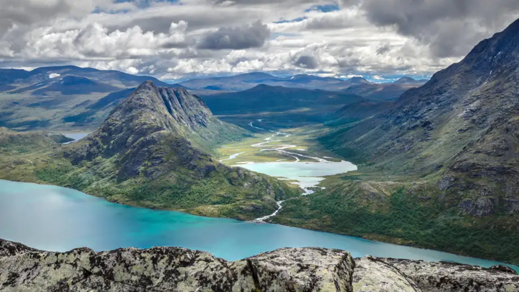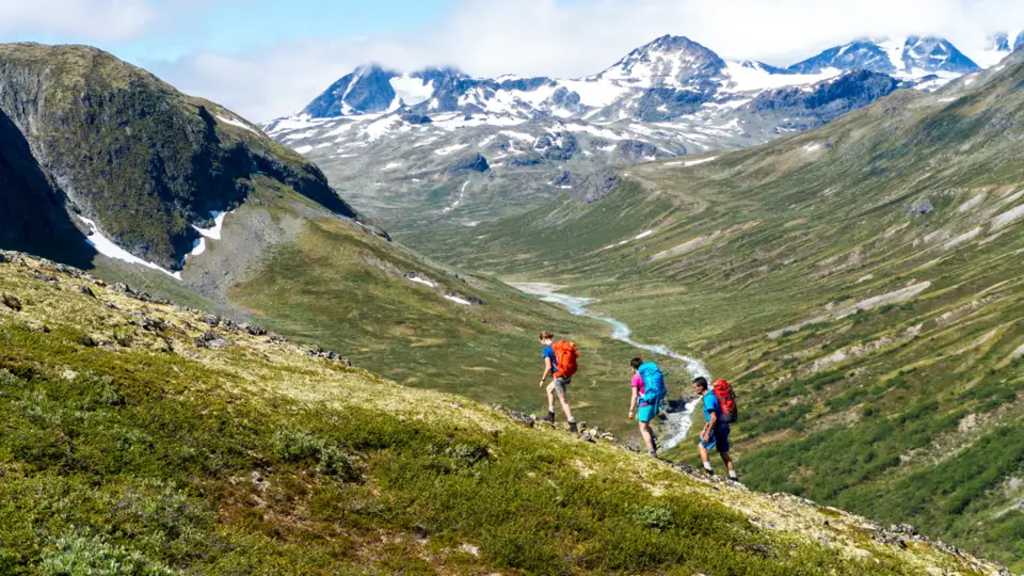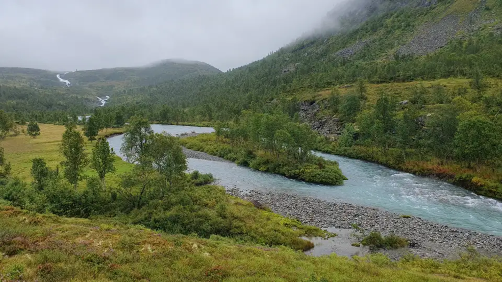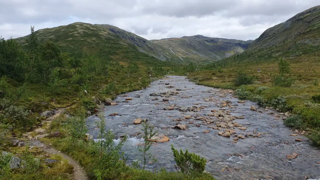 <Am Morgen setzen wir mit dem Boot von Memurubu nach Gjendebu über (ca. 30 min.). Wir lassen den Gjende-See hinter uns und wagen uns tiefer in die Bergwelt von Jotunheimen vor. Immer am Fluss Storåe entlang, wandern wir in gleichmäßigem bergauf durch das Tal Storåedalen. Je nach Wasserstand ist hin und wieder einer der Nebenbäche zu queren. Sind die Berghänge und Wiesen um uns herum zunächst noch von Birkenwäldern und Heidekraut bedeckt, wird die Landschaft allmählich kahler, der Pfad felsiger, die Berge schroffer und zunehmend von Schneefeldern überzogen. Wir passieren kristallklare Bergseen und haben das Herz des höchsten Gebirge Norwegens erreicht. An einem See und umringt von zahlreichen Gipfeln und Gletschern übernachten wir in der Berghütte Leirvassbu. -