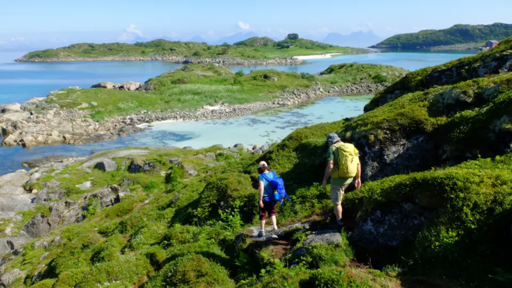 <Heute setzen wir vom nahegelegenen Svolvær mit der Fähre (ca. 30 Min.) über auf die kleine vorgelagerte Insel Skrova. Vom Hafen aus führt uns ein Rundweg über das hügelige grüne Eiland. Wir steigen hinauf zur höchsten Erhebung, der Høgskrova, und lassen den Blick über die kleinen Sandbuchten am türkisfarbenen Meer sowie die gegenüberliegenden Bergzacken schweifen. Danach steigen wir ab zum Socks-Strand. Wer wagt ein Bad im Meer bevor uns die Fähre wieder zurück bringt? Je nach Fährzeiten bleibt uns vielleicht noch etwas Zeit für einen Bummel durch die Gassen von Svolvær. -