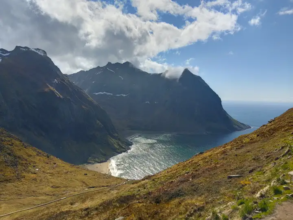 <Ab in den Süden: Wir fahren auf die südlichste Insel der Lofoten, nach Moskenesøya. Beeindruckende Felswände, tiefe Fjorde und weiße Sandstrände prägen das idyllische Bild. Ein Trampelpfad führt uns bergauf - keine Bäume, wenig Büsche und dafür ganz viel Weitblick: Im Westen auf das das offene Meer, im Osten auf den bauchigen Djupfjord, im Süden auf die Landspitze von Moskenes und im Norden auf die kantigen Gipfel. Unter uns liegt die Kvalvika-Bucht, das beliebteste Fotomotiv der Lofoten - Akkus laden nicht vergessen. Kvalvika bedeutet Wal! -