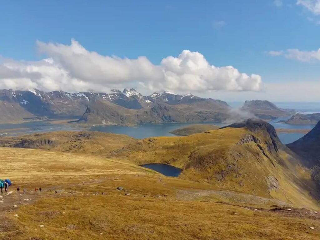 <Nach der gestrigen langen Anreise starten wir heute in der näheren Umgebung. Wir steigen über einen Schotter- und Wiesenweg auf, bis wir schließlich in gerölligere Regionen kommen. Ein letzter steiler Steig führt uns zum Gipfel des Glomtinden (309 m). Weniger grün, dafür umso aussichtsreicher: Vom Plateau aus blicken wir in alle Richtungen über die fantastische Wasserwelt des Vestfjord und auf den mächtigen Vågakallen! Nach einer ausgiebigen Pause wandern wir zurück. Wie wäre es mit einem Saunagang oder Entspannen im Hot Tub am Abend - Fjordblick inklusive! -