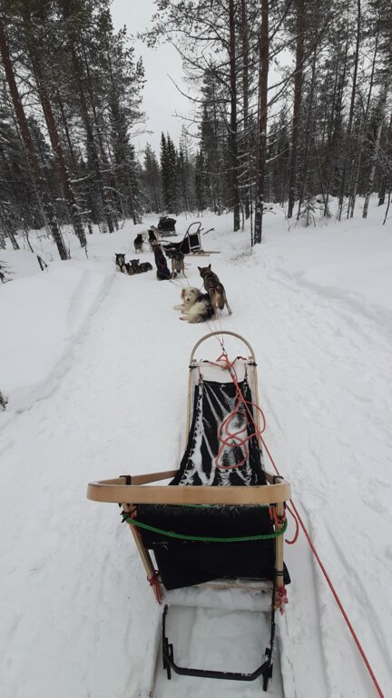 <Nach dem Frühstück brechen wir zu einer Tagestour mit den Hundeschlitten auf (ca. 4 - 6 Std.). Noch liegt eine gleichmäßige Schneedecke auf der Natur, doch schon bald ziehen unsere Schlitten Spuren in den Schnee. Die Welt gehört uns alleine - zumindest fühlt es sich so an. In den Wäldern Lapplands werden wir sicher keine anderen Menschen antreffen, höchstens ein paar neugierige Tiere. Unser Mittagessen bereiten wir heute wieder in freier Natur zu: am Lagerfeuer! Wir stärken uns für den Nachmittag, lassen die Hunde eine Weile ausruhen und setzen dann unsere Schlittentour fort. Den Abend verbringen wir wieder in geselliger Runde in der Saija Lodge. -