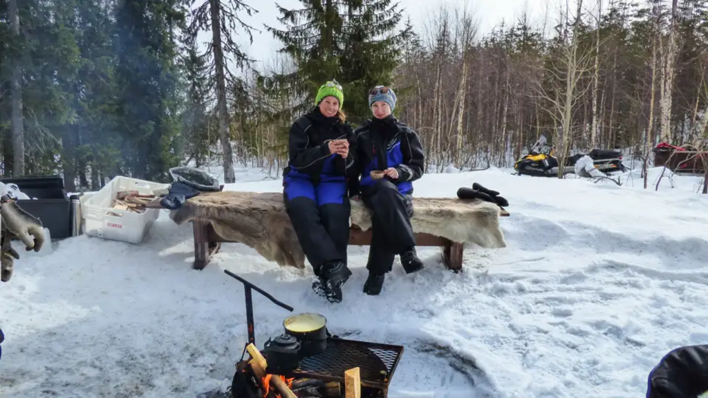 <Der Tag beginnt mit einem Erlebnis der besonderen Art: Wir rüsten uns mit Helm und Overall und machen es uns auf dem Schneemobil bequem. In Windeseile brausen wir durch die finnische Wildnis, gleiten über unberührte Felder und durch tiefen Pulverschnee. Natürlich kreuzen wir auch durch den dichten Wald! Zur Mittagszeit suchen wir uns ein nettes Plätzchen und machen ein wärmendes Lagerfeuer - Wildnis pur! Aufgewärmt und gestärkt fahren wir weiter durch den Schnee und halten Ausschau nach den Tieren. Vielleicht lässt sich ein Elch zwischen den Bäumen blicken? Am frühen Abend kehren wir zur Lodge zurück. -