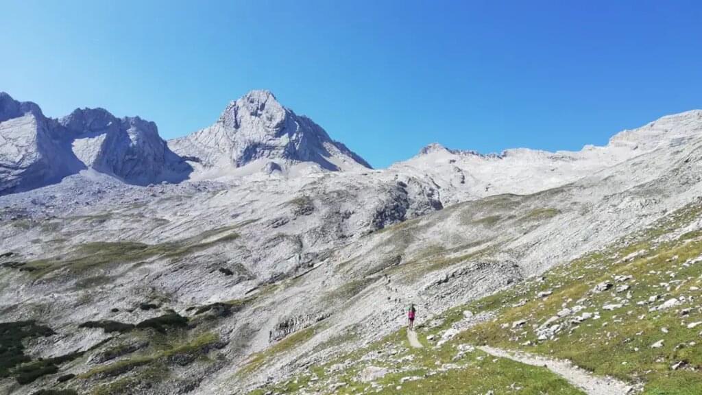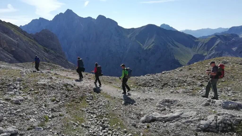 <Nach einen stärkenden Frühstück machen wir uns zu unserer heutigen Etappe auf den Weg uns stehen nur wenig später staunend am Seebensee, der still, türkis und perfekt eingerahmt vom Massiv der Zugspitze vor uns liegt. Über steile Serpentinen erreichen wir die Coburger Hütte, die uns mit ihrem Blick auf den Drachensee zu einer kurzen Rast einlädt. Wieder auf der Route windet sich unser Weg am Ufer entlang und schraubt sich anschließend hoch zur Grünsteinscharte (2.263 m), einem schmalen, spektakulären Durchschlupf zwischen steilen Felswänden.Der Abstieg ist ein wenig steinig, aber mit jedem Schritt wird das Gelände wieder sanfter. Bald schon erreichen wir das Lehnberghaus und wandern noch ein kurzes letztes Stück nach Arzkasten. Von dort bringt uns ein kurzer Transfer durchs Inntal zum Alpengasthof Praxmar – gemütlich, abgelegen und umgeben von Tiroler Bergidylle. Ein perfekter Ausklang für einen eindrucksvollen Tag. -