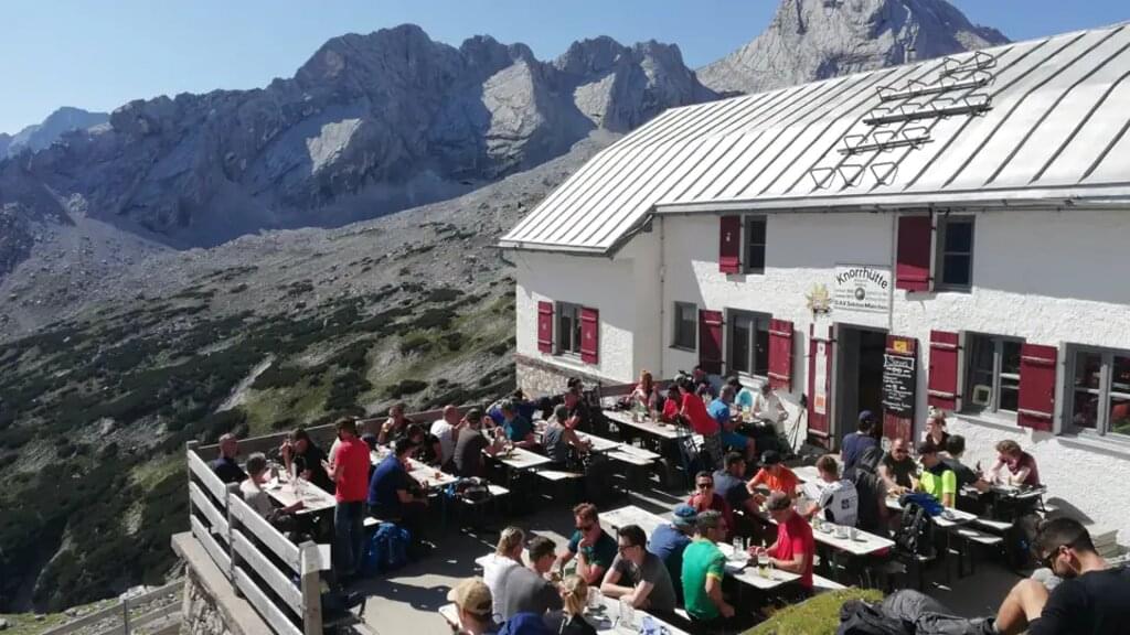 <Wir treffen uns am Zugspitzbahnhof in Garmisch-Partenkirchen und fahren, nach der Begrüßung durch unsere(n) Bergwanderführer(in), mit der traditionsreichen Zugspitzbahn hinauf aufs Zugspitzplatt (2.580 m). Umgeben von hochalpiner Landschaft und einem fantastischen Panorama beginnt unsere gemeinsame Wanderwoche daher gleich mit einem absoluten Highlight. Mit Tiefblick ins Reintal steigen wir gut eine Stunde bergab zur Knorrhütte, der ältesten Schutzhütte des Alpenvereins. Nach einer ersten Rast geht es weiter zum Gatterl (2.024 m), dem Übergang zwischen Bayern und Tirol. Ein kurzes, drahtseilversichertes Stück führt uns ins Feldernjöchl, wo wir vom schroffen Hochgebirge ins sanfte Almgelände wechseln. Der Blick zu den imposanten Mieminger Bergen begleitet uns bis zur urigen Hochfeldern Alm, wo wir auf der Sonnenterrasse ankommen und den ersten Wandertag entspannt ausklingen lassen. -