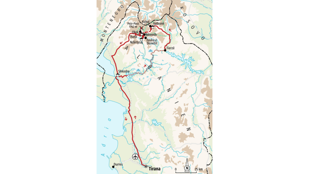 <Individuelle Anreise nach Tirana. Am Flughafen werden Sie von Ihrem Fahrer begrüßt und nach Shkodra gebracht. Dort treffen Sie heute einen Vertreter unserer albanischen Partneragentur, der mit Ihnen alle Details der Reise durchgeht und Ihnen für Ihre Wanderwoche ein GPS-Gerät und ein Telefon übergibt. Je nach Ankunft bleibt vielleicht noch Zeit für einen Bummel durch die Stadt, einen Spaziergang hinauf zur Burg oder einen Ausflug zum Shkodra-See, dem größten See der Balkanhalbinsel. -