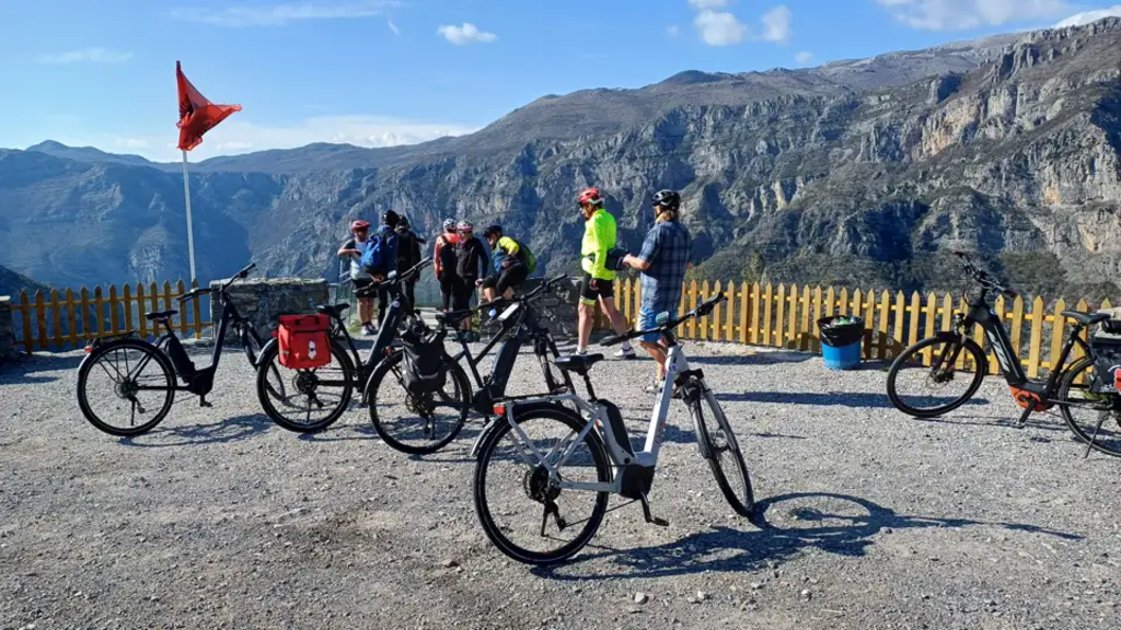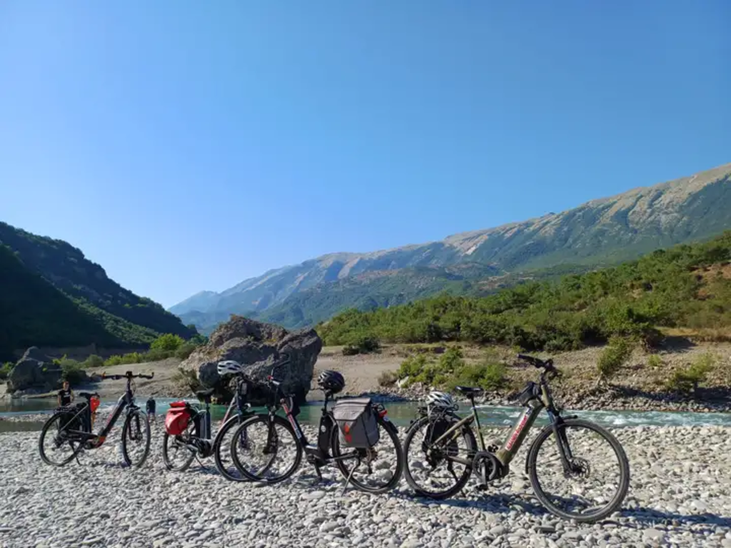 <Heute radeln wir nach Këlcyrë und bestaunen die zackigen "Trebeshinë -Gipfel", bezeichnend für die schroffe Bergwelt Albaniens und dann weiter entlang des Vjosa Tals und den Zuflüssen des Drinos einer Schlucht folgend bis zum Ende des Tals. Nach dieser beeindruckenden Fahrt nahe dem Wasser erfolgt ein kurzer Transfer zur Stadt Gjirokastër, einem UNESCO-Weltkulturerbe. Diese "Stadt der Steine", die majestätisch hoch oben am Hang liegt, erkunden wir über schmale Kopfsteinpflasterstraßen und bewundern osmanische Häuser. Wir erkunden den Bazar und die hoch über der Stadt thronende Silberburg mit grandiosem Ausblick. Am Nachmittag bringt uns der Bus zum Muzinë Pass. Von dort radeln wir durch wunderschönes Bergland über herrliche Kurven begleitet von mediterranem Flair bis zur ewigen Wasserquelle "Blaues Auge". Wir genießen die mystische Atmosphäre am glasklaren, türkisblauen Wasser umgeben von leuchtenden Bergen. Je nach verfügbarer Zeit legen wir die letzte Etappe nach Sarandë mit dem Rad oder Fahrzeug zurück und besichtigen die Burg Lëkurësi, mit Blick über die Stadt Sarandë. -
