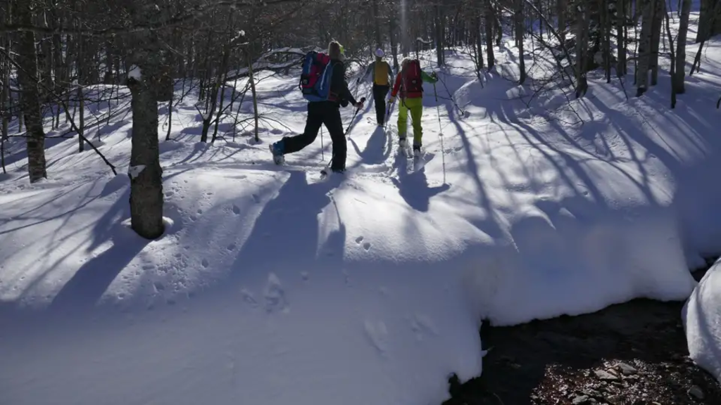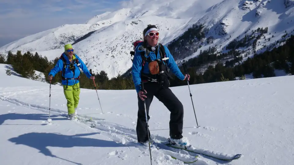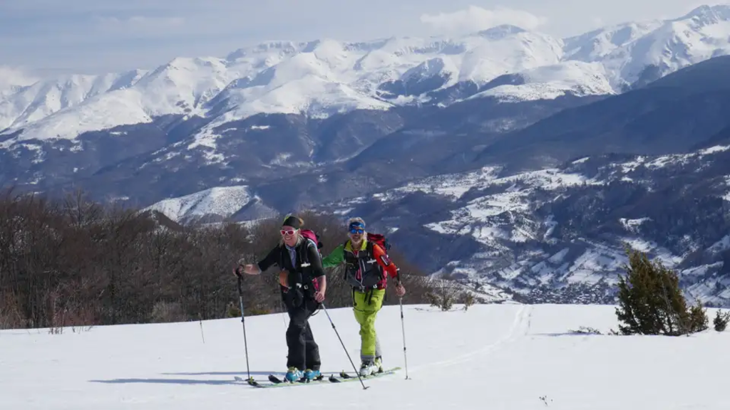 <Von Dragash aus erreichen wir nach kurzer Fahrt ein kleines Dorf der Volksgruppe der Goranen. Unser Aufstieg beginnt auf 1.350 m und führt mit Blick über die Dächer und die Gipfel der Umgebung in den Wald. Nach etwa drei Stunden haben wir die Bergspitze des Kleq (2.467 m) erreicht. Vom Kamm, der die Grenze mit Nordmazedonien bildet, blicken wir auf das hübsche Leshnica-Tal hinab und auf den zweithöchsten Gipfel des Nachbarlandes, den Titov Vrh (2.747 m). Die Abfahrt auf den schönen Nordhängen ist ein Genuss. Anschließender fahren wir zu unserem Hotel am Prevalla-Pass, der Ausgangsbasis unserer Touren der nächsten Tage. -
