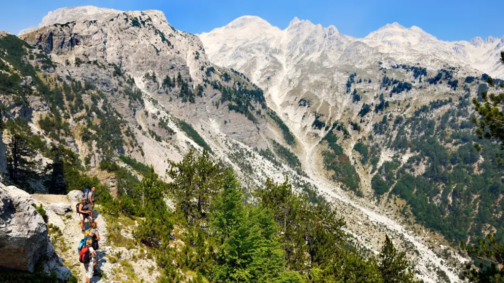<Nach einem kurzen Transfer haben wir den Ausgangspunkt unserer Trekkingtour erreicht. Wir schnüren die Wanderschuhe, schultern den Tagesrucksack - dann geht es los! Zunächst haben wir einen langen Aufstieg zum Persllopit-Pass (2.039 m) vor uns. Schritt für Schritt steigen wir über einsame Almweiden und durch schattige Wälder auf, die höchsten Gipfel der Albanischen Alpen immer im Blick. Der Persllopit-Pass bildet die Grenze zu Montenegro, eine gute Stunde sind wir im Nachbarland unterwegs. Wir wandern vorbei an einer Höhle, in der ganzjährig Schnee liegt, und durch labyrinthartiges Karstgebiet, dann geht es zurück nach Albanien und wir steigen ab in das abgeschiedene Dörfchen Cerem. Vielleicht treffen wir unterwegs einen Schäfer mit seiner Herde und dürfen einen Blick in seine Hütte werfen. In Cerem übernachten wir heute in einem einfachen Gästehaus. Strom und Handyempfang gibt es hier nicht. Die herzliche Gastfreundschaft unserer Gastgeber und das deftige Abendessen mit Zutaten frisch aus dem Garten machen den Mangel an Komfort aber sicher wett. -