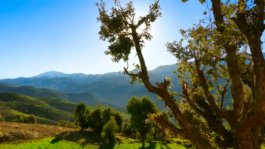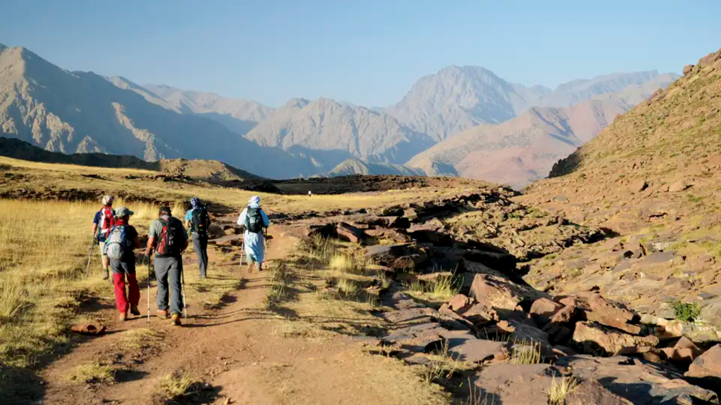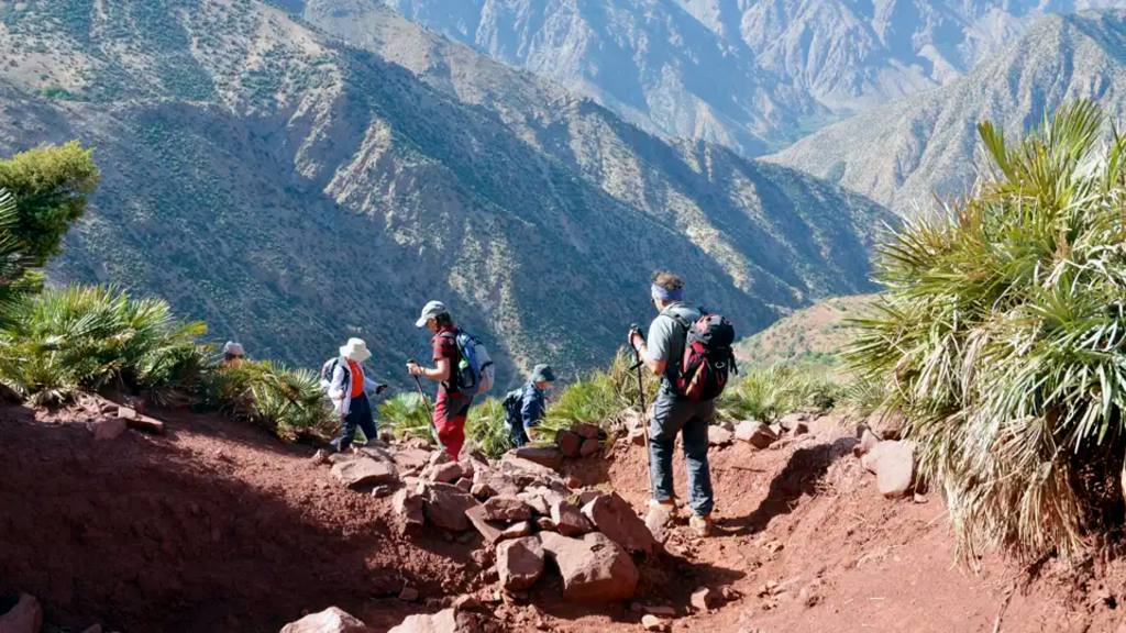 Weiter über das Plateau führt unser Weg hinauf zum aussichtsreichen Felsen Jebel Issif (2.800 m) und dann steil hinunter ins Tissalmit-Tal. Nachmittags gelangen wir hinab durch einen Wacholderwald zum Marktdorf Zaouiat Ahancal (1.600 m) am gleichnamigen Fluss. Typisch für einige Dörfer in dieser Region sind die verschachtelten und übereinander getürmten einfachen Häuser. In den Hochtälern treffen wir auf die Lagerplätze der Halbnomaden. Sie leben hier nach der Schneeschmelze in, aus schwarzer Schafwolle gefertigten Zelten, sogenannten Khaimas. Wir übernachten in einer einfachen Gîte.