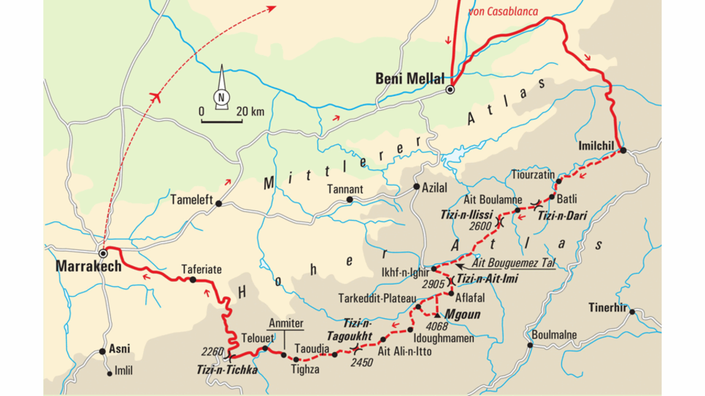 Wir starten früh zu unserem dreistündigen Aufstieg durch Wacholderwald und über vegetationsarme Hänge zum aussichtsreichen Tizi n'Ait Imi (2.900 m). Bei klarem Wetter eröffnet sich vom Pass erstmals ein faszinierendes Panorama auf die höchsten Berge des Hohen Zentralatlas, darunter die Gipfelkette des über 4.000 m hohen Mgoun-Massives. Nach moderatem Abstieg erreichen wir den Asif Amougr Saln mit der Speicherburg Tighremt n'Ait Ahmed. Von hier wandern wir ins Oulilimt-Tal hinein bis zu unserem Lagerplatz nahe der Quelle von Aflafal (2.300 m).