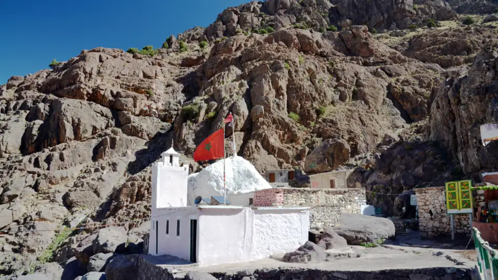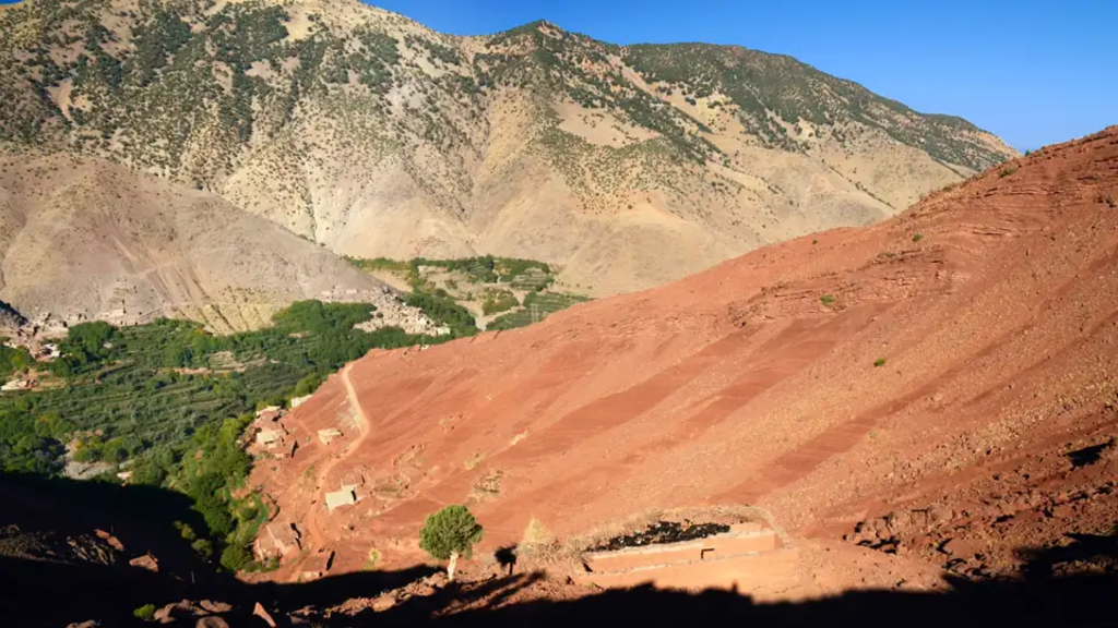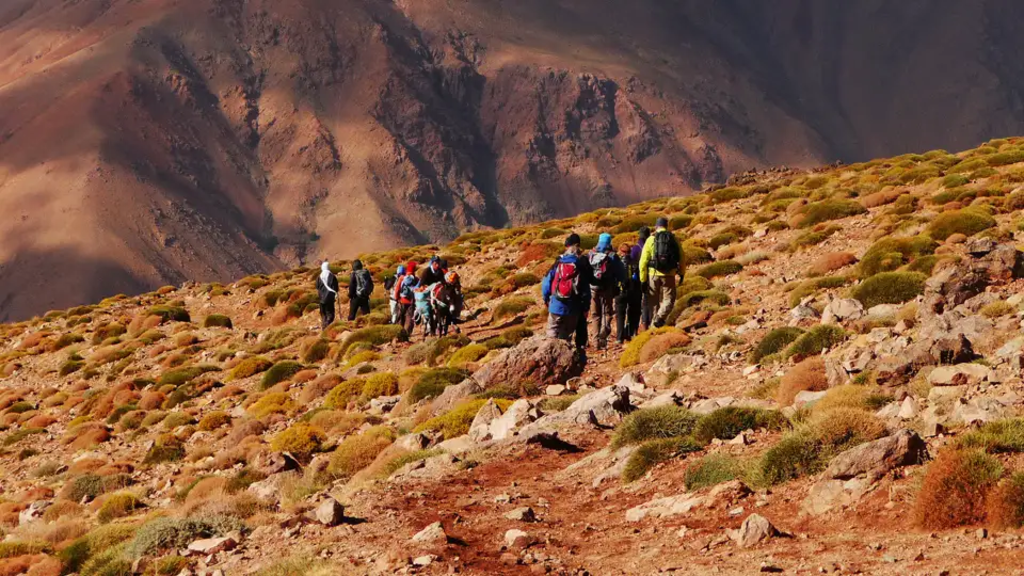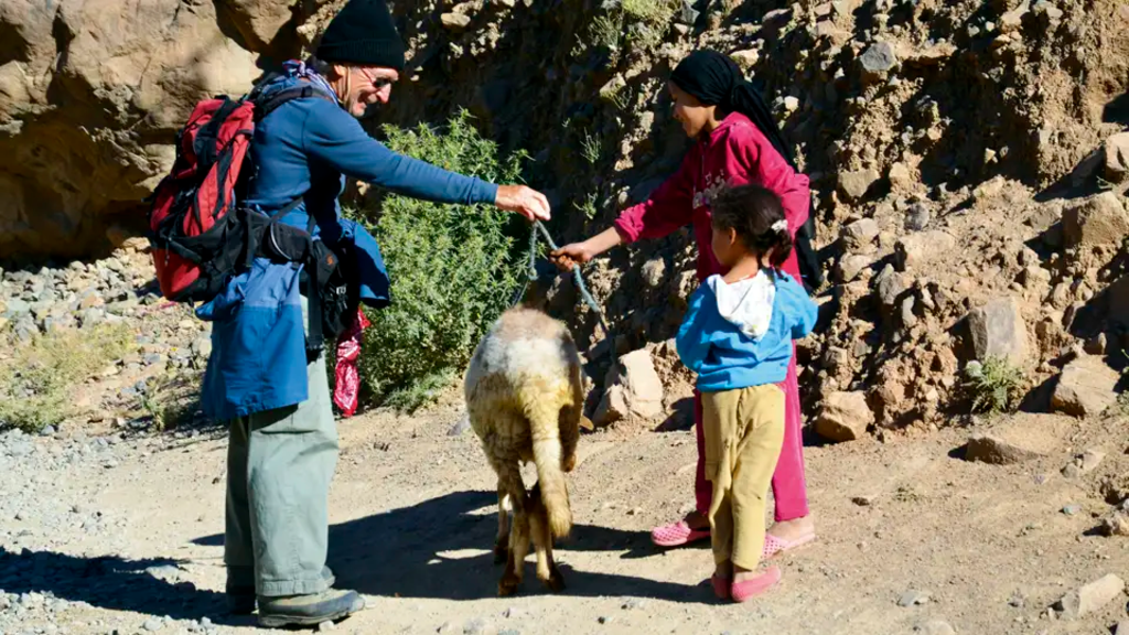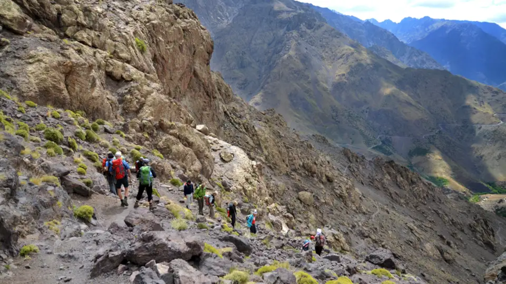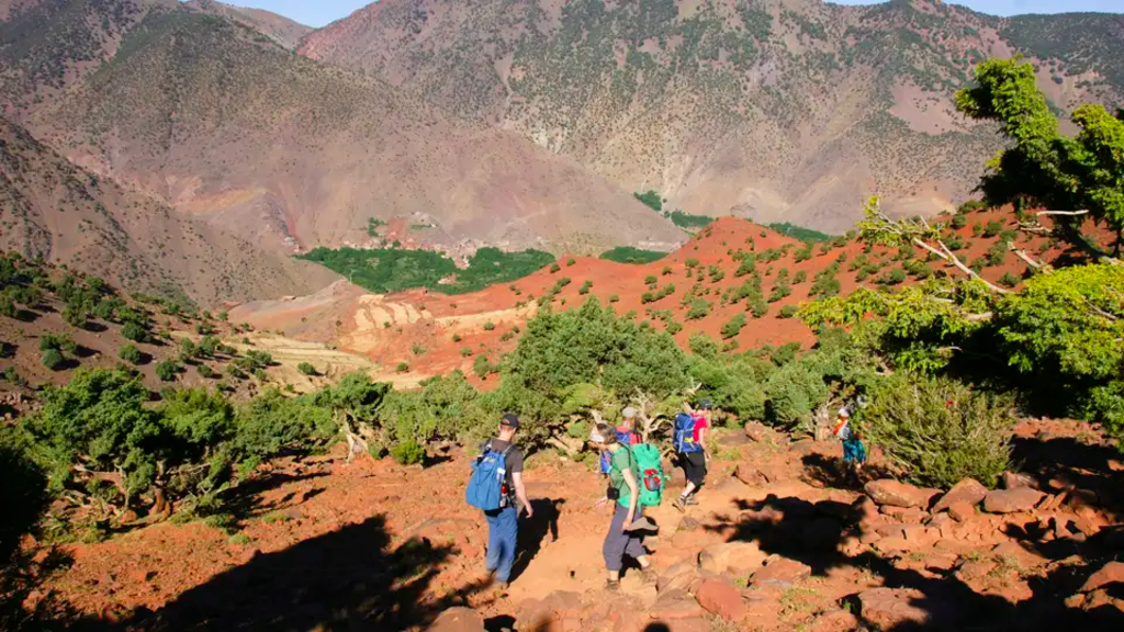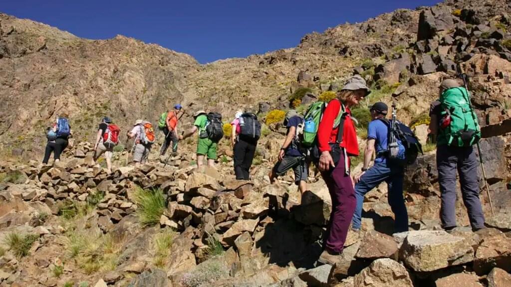 <Morgens folgen wir dem Tal und wandern oberhalb einer tief eingeschnittenen Schlucht. Frühmorgens können wir sehen, wie die Schäfer die Tiere über Nacht in den bizarren Schluchtwänden in scheinbar unerreichbaren und durch Steine befestigten Nischen schützen. Erst bei Tagesanbruch, wenn kein Schakal mehr zu befürchten ist, werden die Schafe und Ziegen wieder auf die Weiden geführt. Wir erreichen den Pass Tizi n´Igrane (2.000 m), von dem aus ein teils steiler Abstieg durch von Bergpalmen üppig bewachsene Hänge folgt. Die hiesige Palmenart wird nicht sehr hoch und bildet schöne, fächerartige Blätter. Wir steigen bis ins Tal ab und überqueren bei einer Hängebrücke den Bach des Ourika-Tals. Der über eine Straße erreichbare Ort Setti Fatima ist ein beliebtes Ausflugs- und Pilgerziel. Wir folgen dem Tal noch eine halbe Stunde weiter bis zu unserem Camp bei Walnussbäumen, am Eingang der Ait Boulmane-Schluchten (1.480 m). -