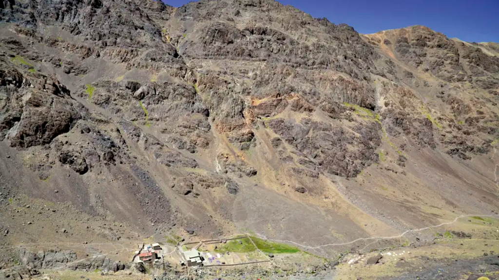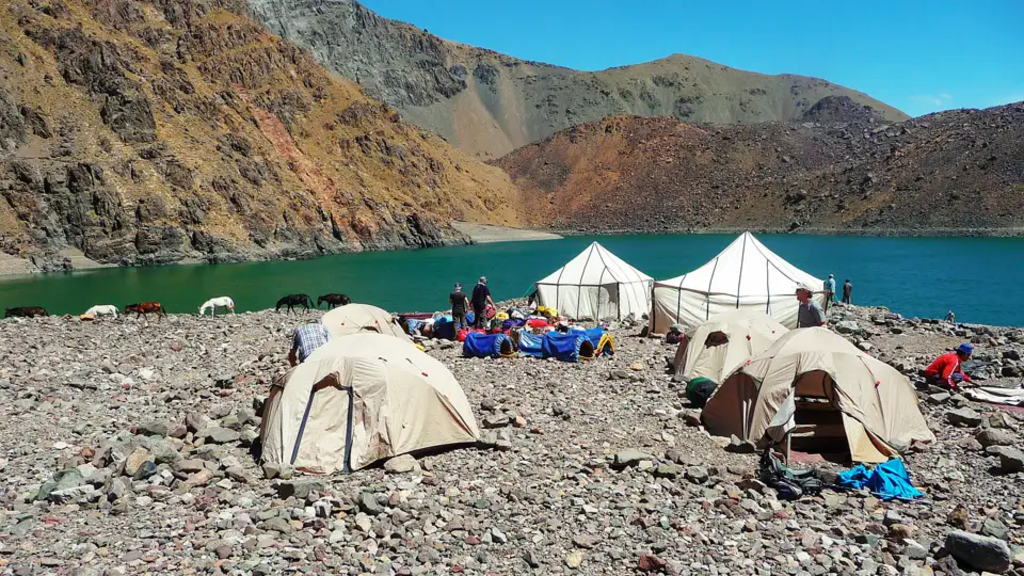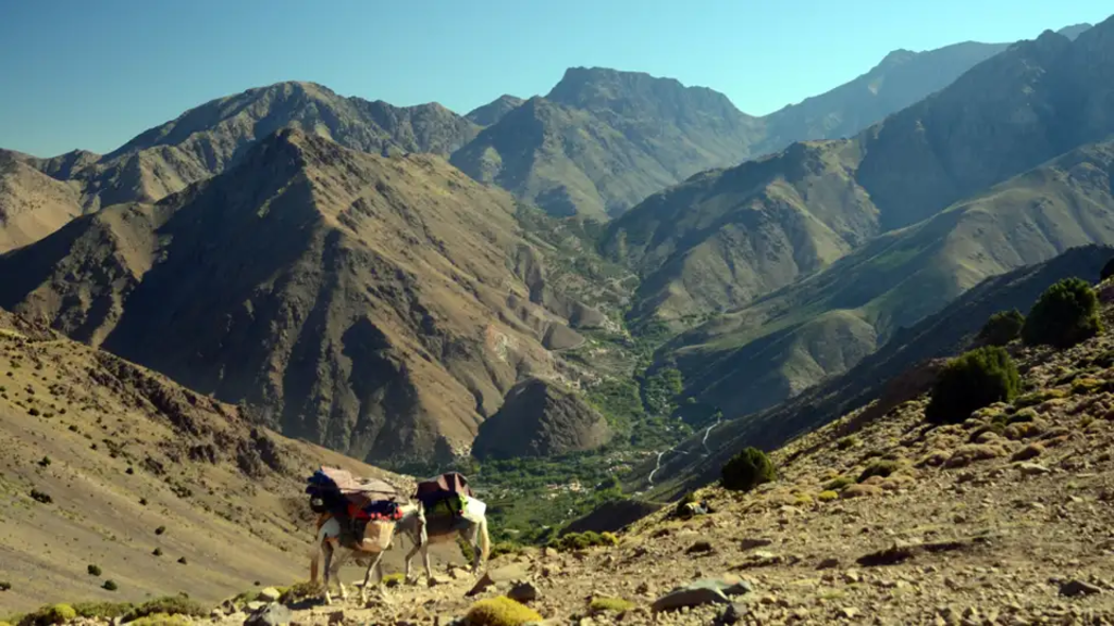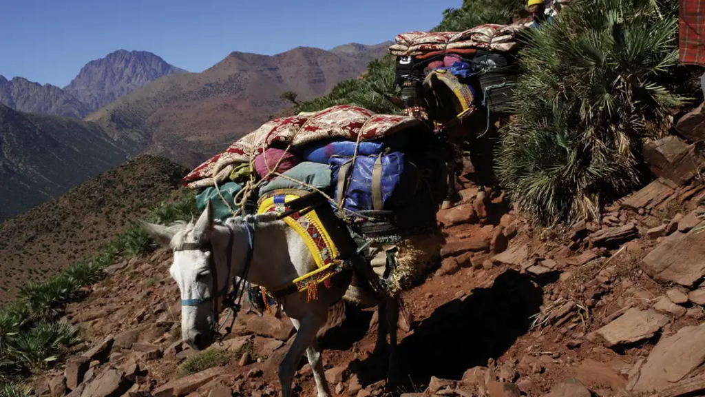 <Nach unserem Frühstück besichtigen wir zu Fuß die Medina von Marrakech, die zu Recht seit vielen Jahren UNESCO-Weltkulturerbe ist. Wir kommen an der Koutoubia-Moschee vorbei, mit dem 77 m hohen Minarett, Wahrzeichen der Stadt. Wir bestaunen das Tor Bab Agnaou, ein monumentales Stadttor und besuchen die nahe gelegenen, reich ornamentierten Sultans-Gräber der Saadier-Dynastie. Wir besichtigen den reich mit Mosaiken verzierten Bahia-Palast mit seinem idyllischen Innenhof. Kleine Gassen mit Werkstätten und Kunsthandwerkläden führen zur Medersa Ben Youssef. Ein verschwenderisch mit Stuck und Mosaikfließen verzierter Innenhof bildet den Mittelpunkt der über 400 Jahre alten Koranschule. Nachmittags fahren wir mit einem Kleinbus Richtung Süden ins Atlas-Gebirge. Schließlich erreichen wir das Dorf Arba Tighedouine (ca. 800 m). Wir fahren auf einer neu asphaltierten Straße ins Zat-Tal hinein und erreichen unser erstes Camp bei Azgour (1.150 m), wo wir unsere Begleitmannschaft und die Mulis treffen. -