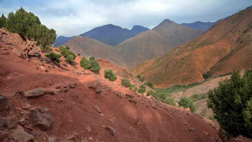 <Schon in der Morgendämmerung starten wir. Ausgerüstet mit Stirnlampen und Wassersandalen oder Turnschuhen wandern wir im erst breiten Bachbett, das dann zu einer immer engeren Schlucht wird. Zwischen unzähligen alten Walnussbäumen plätschert der Bach und wir queren ihn des Öfteren zwischen großen Granitfelsen. Mit etwas Glück können wir im Tal die hier lebenden Berberaffen entdecken. Sie sind eher scheu, können aber in größeren Familien auftreten.Wir steigen wieder in unsere Bergschuhe und wandern aus dem Tal hinaus bergauf bis Tamatert (1.900 m). Riesige, mehrere Hundert Jahre alte, sehr gepflegte Terrassenfelder umgeben die Lehmhäuser des Dorfes. Wir überqueren Bergpässe, rasten in einem großen, von Wasserläufen durchzogenen Wald aus Walnussbäumen und steigen zwischen alten Wacholderbäumen einen Serpentinenweg hinauf. Vom Tizi n´Amanal (2.400 m) genießen wir den Rundblick in die abgelegene Bergwelt. Wir erahnen, was diese Lage für das tief unter uns liegende, von grünen Terrassenfeldern umgebene Dorf Amanzal bedeutet. Sehr einsam, fern jeglicher Straßen gelegen, hat es weder Strom noch Telefonanschluss. Wir begegnen Berberfamilien bei der Feldarbeit und werden freundlich und neugierig betrachtet. Immer einsamer wird es, wenn wir dem schönen Bachlauf stetig bergauf folgen. Nach einem anstrengenden Tag erreichen wir unseren Lagerplatz bei Granitfelsen (2.550 m), am Fuß des Tizi n´Boukchoud. -