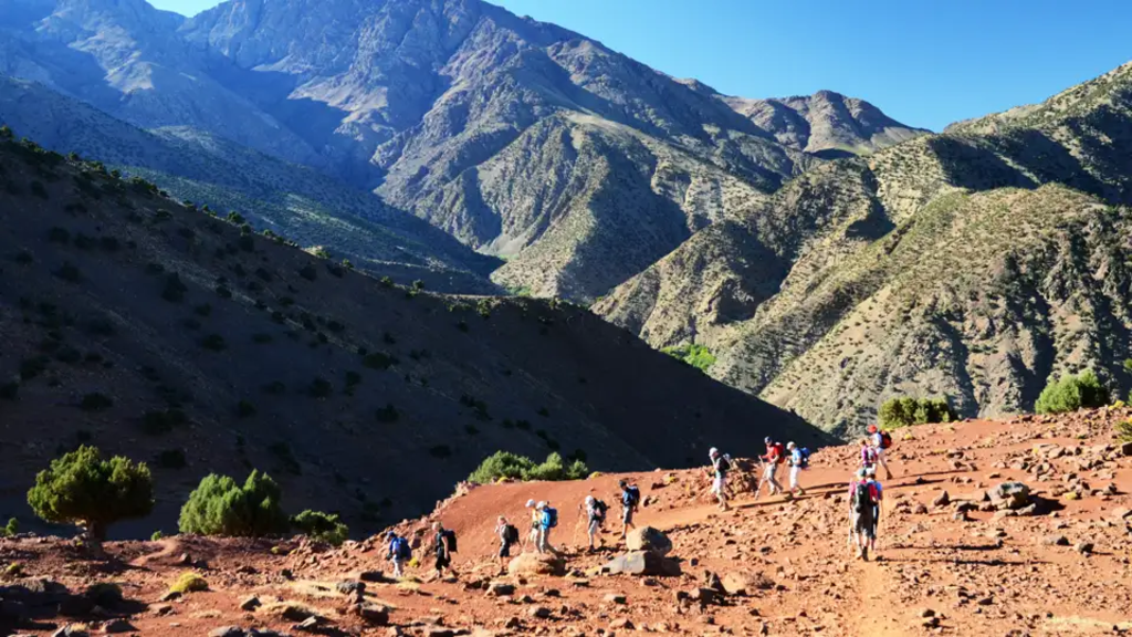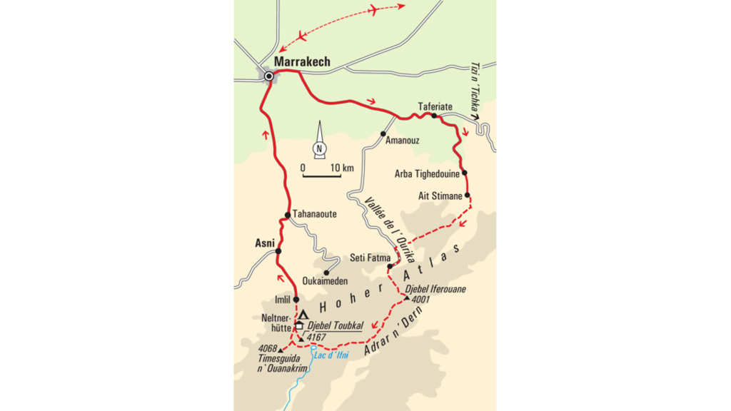 Trekkingreise mit anspruchsvoller Überschreitung des Hohen AtlasWir wandern auf wenig begangenen Pfaden durch terrakottafarbene Berberdörfer und begegnen Nomaden und ihren Schafherden auf den Hochweiden. Der Blick auf den ersten Viertausender eröffnet sich, der einsame Jebel Iferouane hat es mit 4.001 m gerade so in die Reihe der Viertausender geschafft. Wie ein smaragdfarbenes Juwel ruht der Ifni-See inmitten der wilden Gebirgskulisse und lädt zu einem erfrischenden Bad nach der Wanderung ein. Bis wir zum krönenden Abschluss den Toubkal-Nationalpark erreichen, sind wir bereits gut akklimatisiert. Nun können wir den Toubkal (4.167 m), sowie den Ouanoukrim mit seinem Doppelgipfel Timesguida (4.089 m) und Ras Ouanoukrim (4.070 m) besteigen. Es besteht die Möglichkeit bis zu vier 4.000er in Angriff zu nehmen. Zwischen Gipfel und Alternativroute können wir jeweils kurzfristig nach Lust und Laune wählen. Schon die Trekkingroute ohne diese Gipfel bietet Landschaftsgenießern eine lohnende Durchquerung des Hohen Atlas. Nach ausgefüllten Wandertagen genießen wir schöne Lagerplätze inmitten der Natur des Hohen Atlas und die kulinarischen Zauberkünste unseres Trekking-Kochs. Nach unserem 10-tägigen Trekking ist das bunte Treiben der Königsstadt Marrakech ein eindrucksvoller Kontrast zur Abgeschiedenheit der Bergwelt. Wir schlendern durch die verwinkelte Medina der rosaroten Stadt, bevor wir die Reise am Abend bei marokkanischer Küche in einem ehemaligen Palast feierlich ausklingen lassen.
